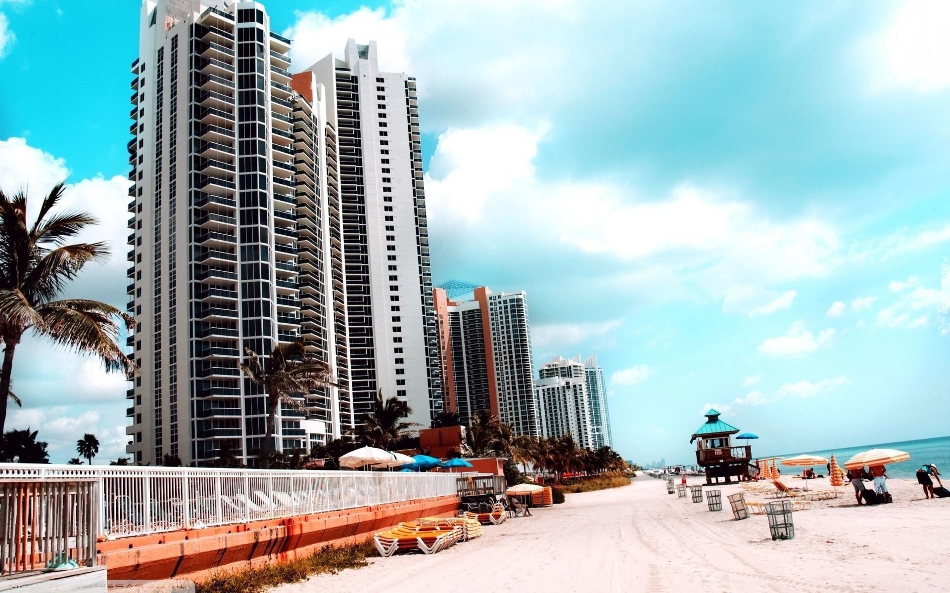 Edytor tapety: Plaża, Turyści, Wieżowce, Palmy, Ocean, Miami, Floryda