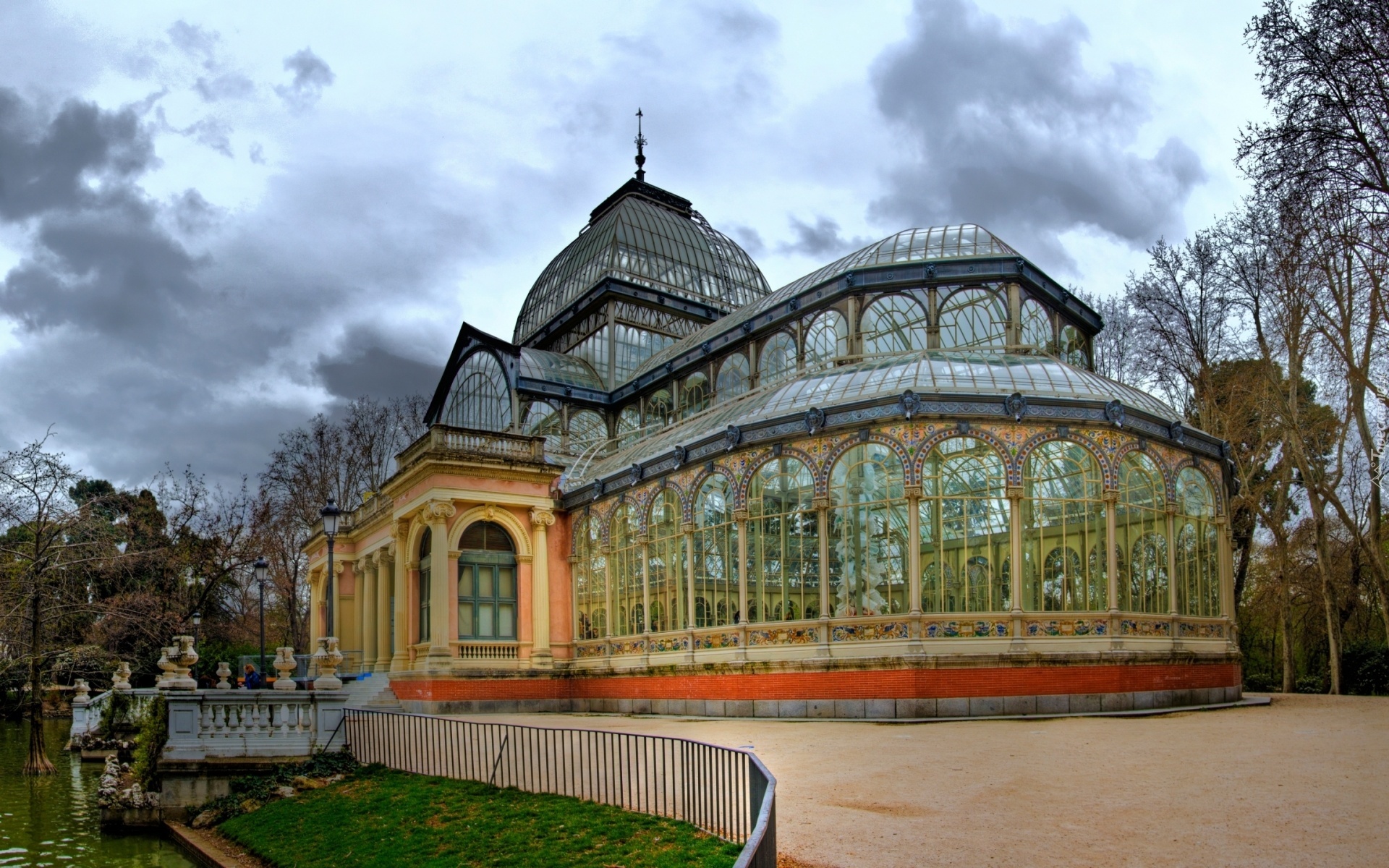 Edytor tapety: Pałac, Kryształowy, Staw, Park, Chmury, Madryt, Hiszpania