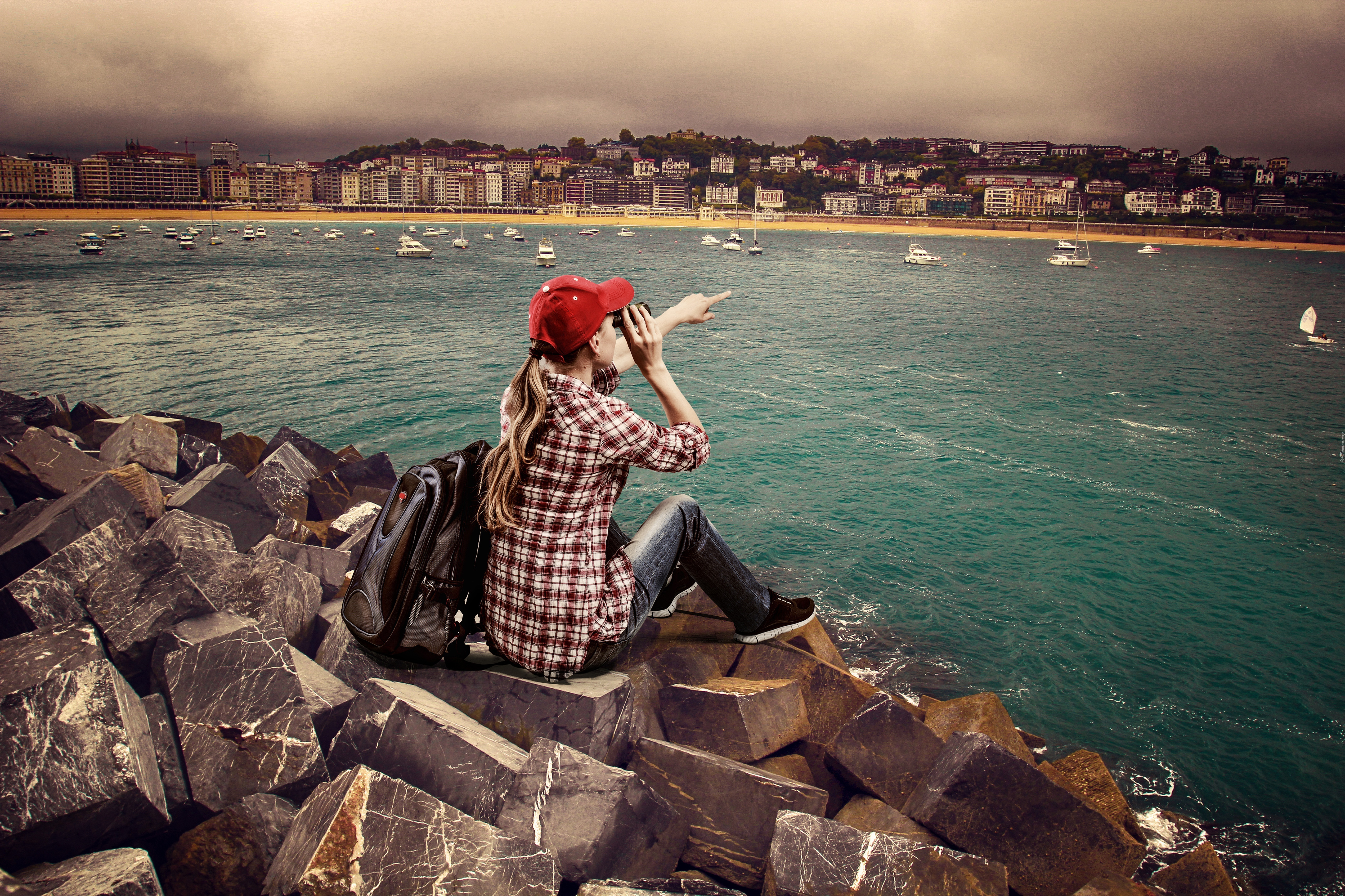 Edytor tapety: Dziewczyna, Lornetka, Kamienie, Rzeka, Motorówki, Miasto