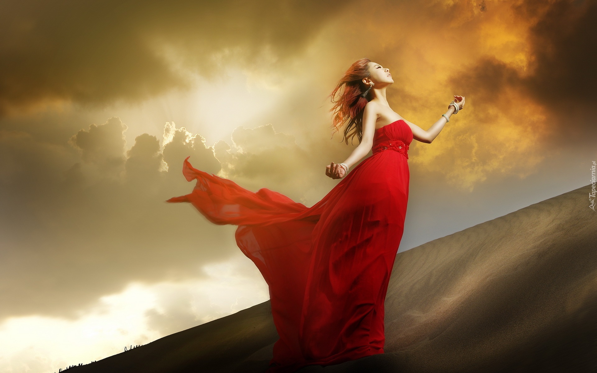 Edytor tapety: Kobieta, Czerwona, Sukienka, Pustynia, Ciemne, Chmury