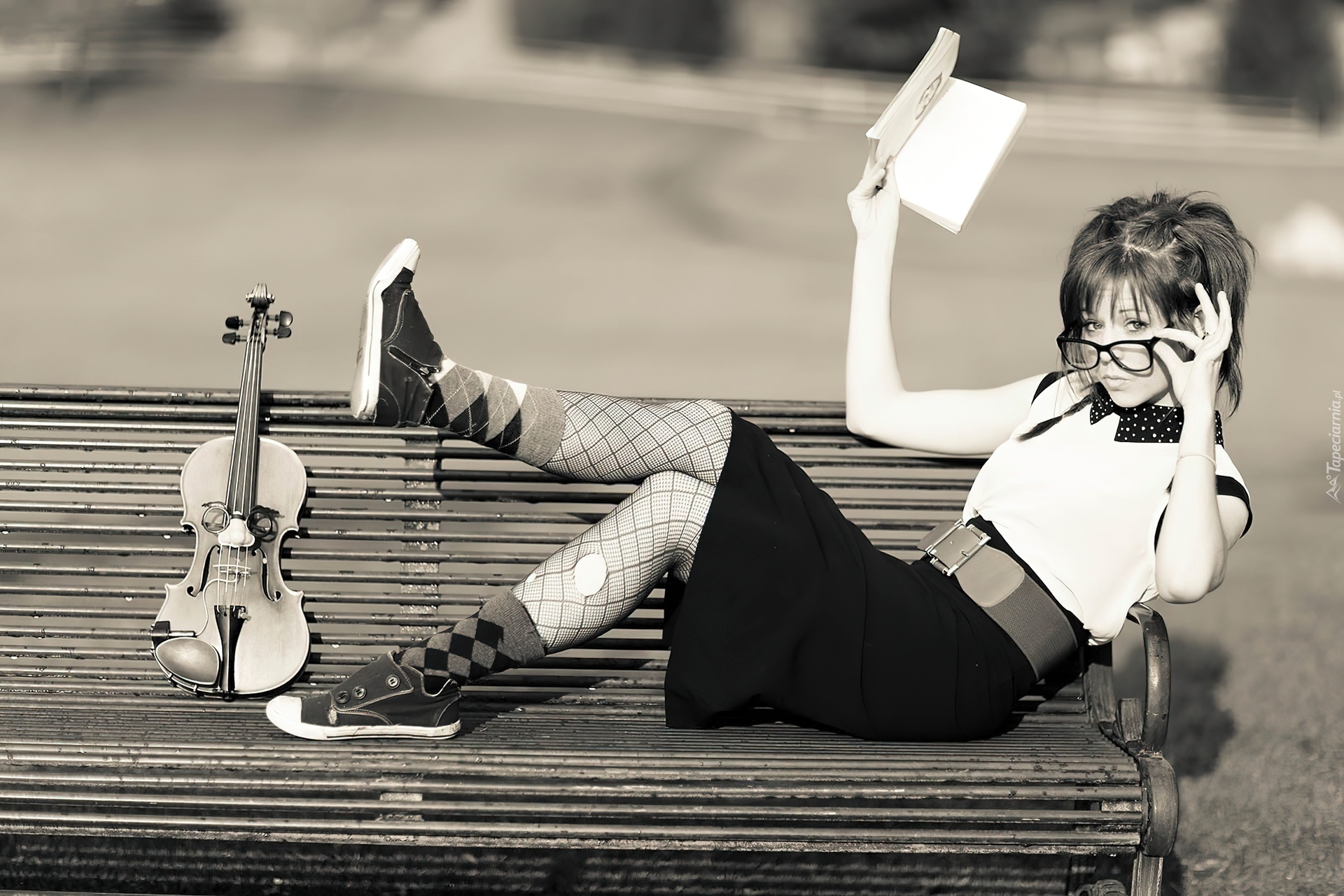Edytor tapety: Lindsey Stirling, Ławka, Skrzypce, Okulary, Książka