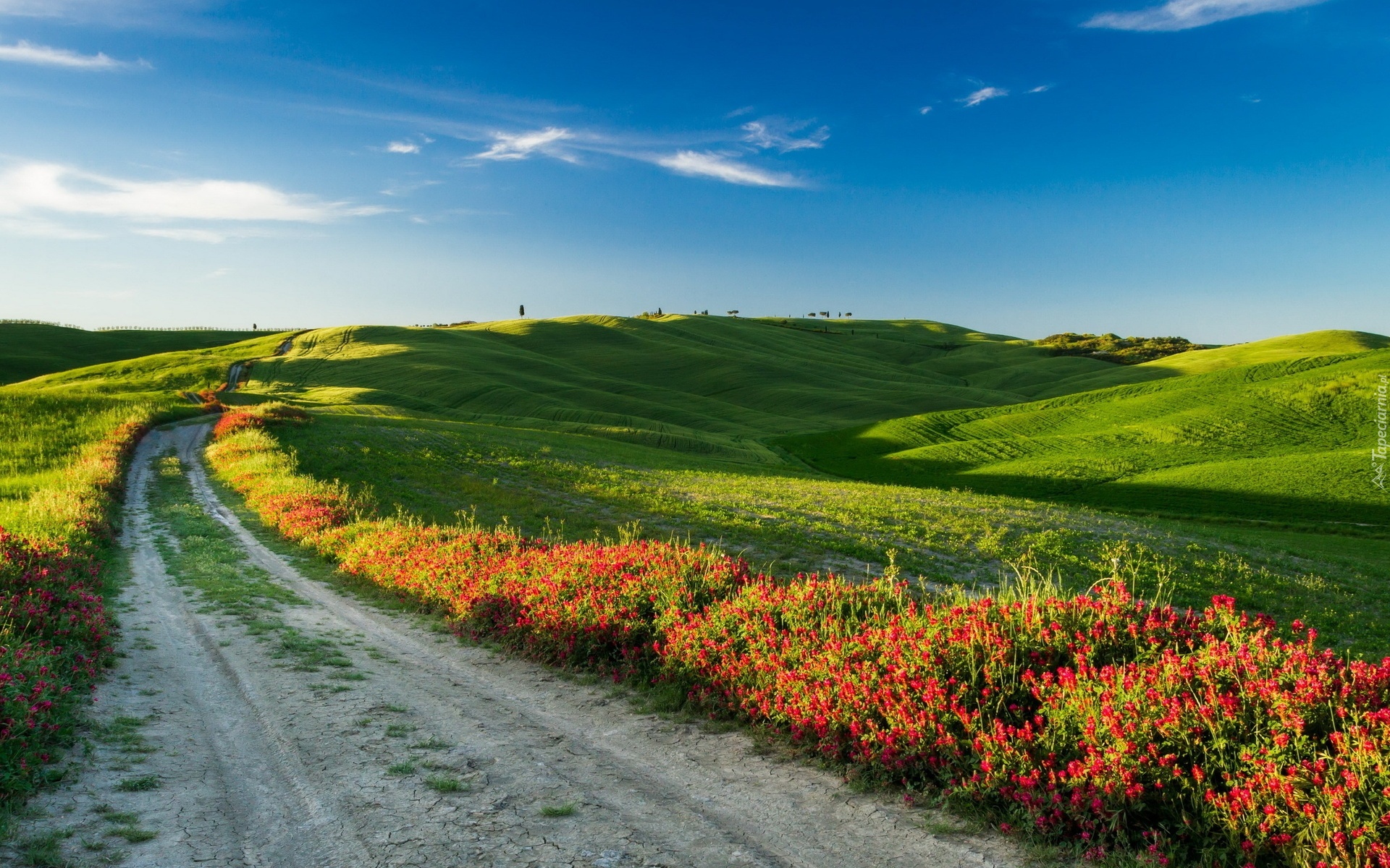 Edytor tapety: Droga, Łąki, Góry, Drzewa, Kwiaty, Toskania, Włochy