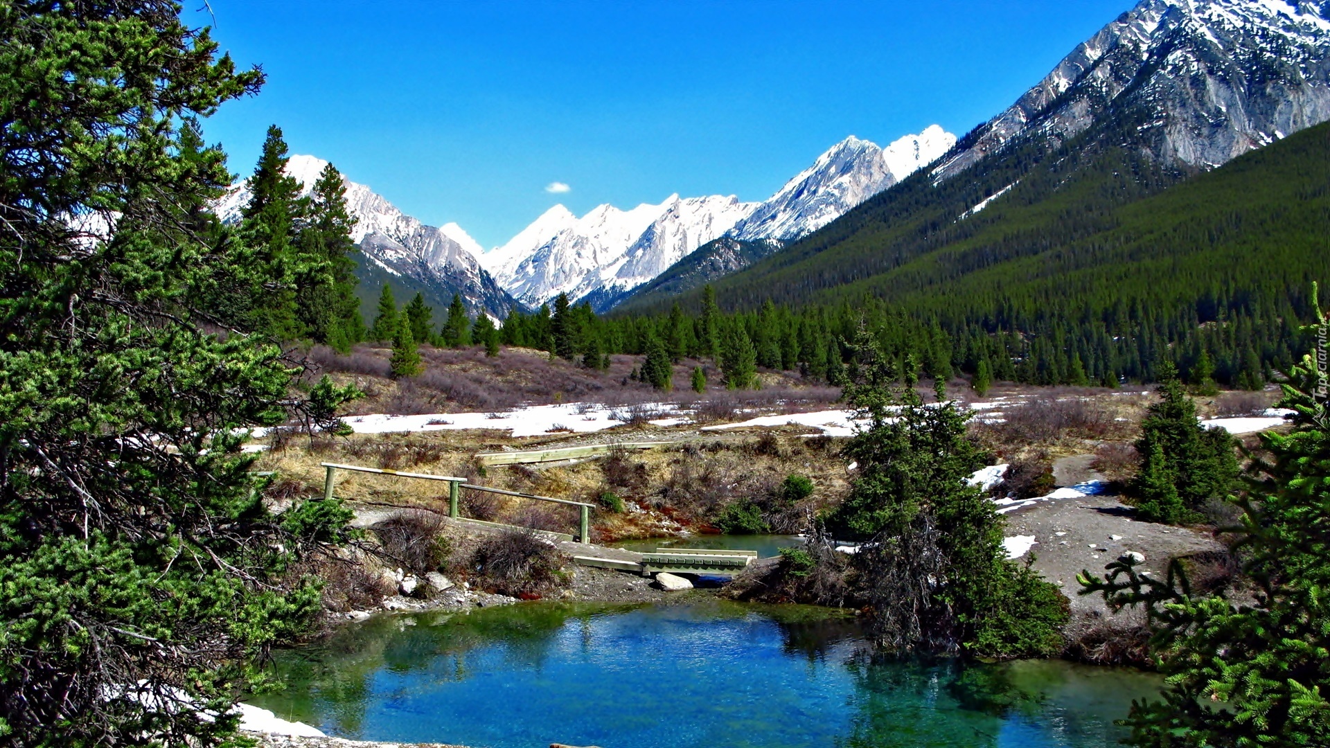 Edytor tapety: Wiosna, Góry, Lasy, Jezioro, Mostek