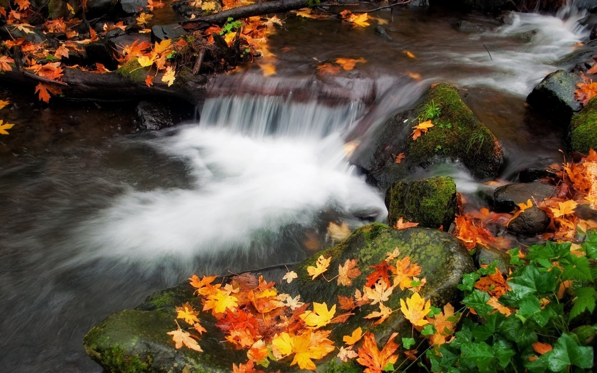 Edytor tapety: Wodospad, Skały, Las, Liście, Jesień