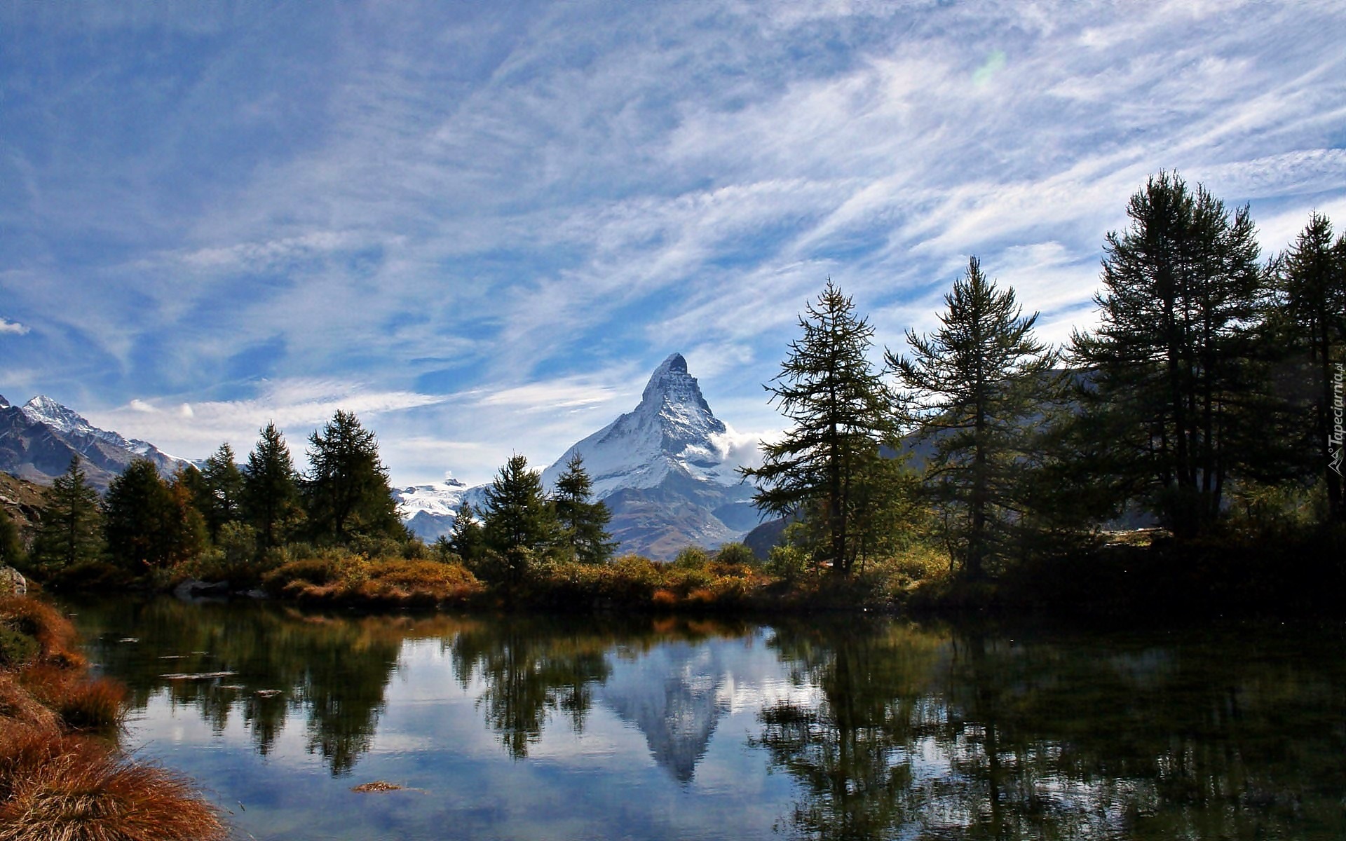 Edytor tapety: Matterhorn, Chmury, Jezioro, Świerki, Odbicie
