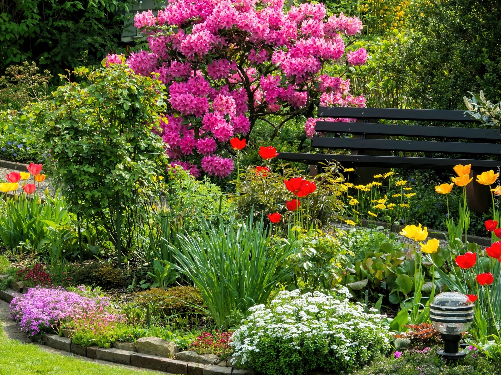 Edytor tapety: Kwietnik, Ławka, Kwiaty, Kwitnące, Drzewa, Ogród, Wiosna
