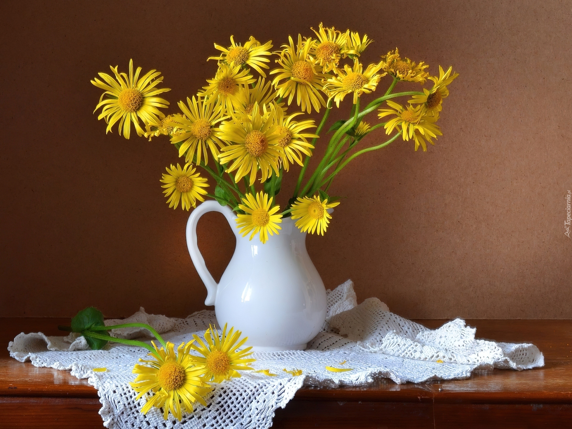 Edytor tapety: Bukiecik, Żółtych, Kwiatów, Dzbanek, Serweta, Kompozycja