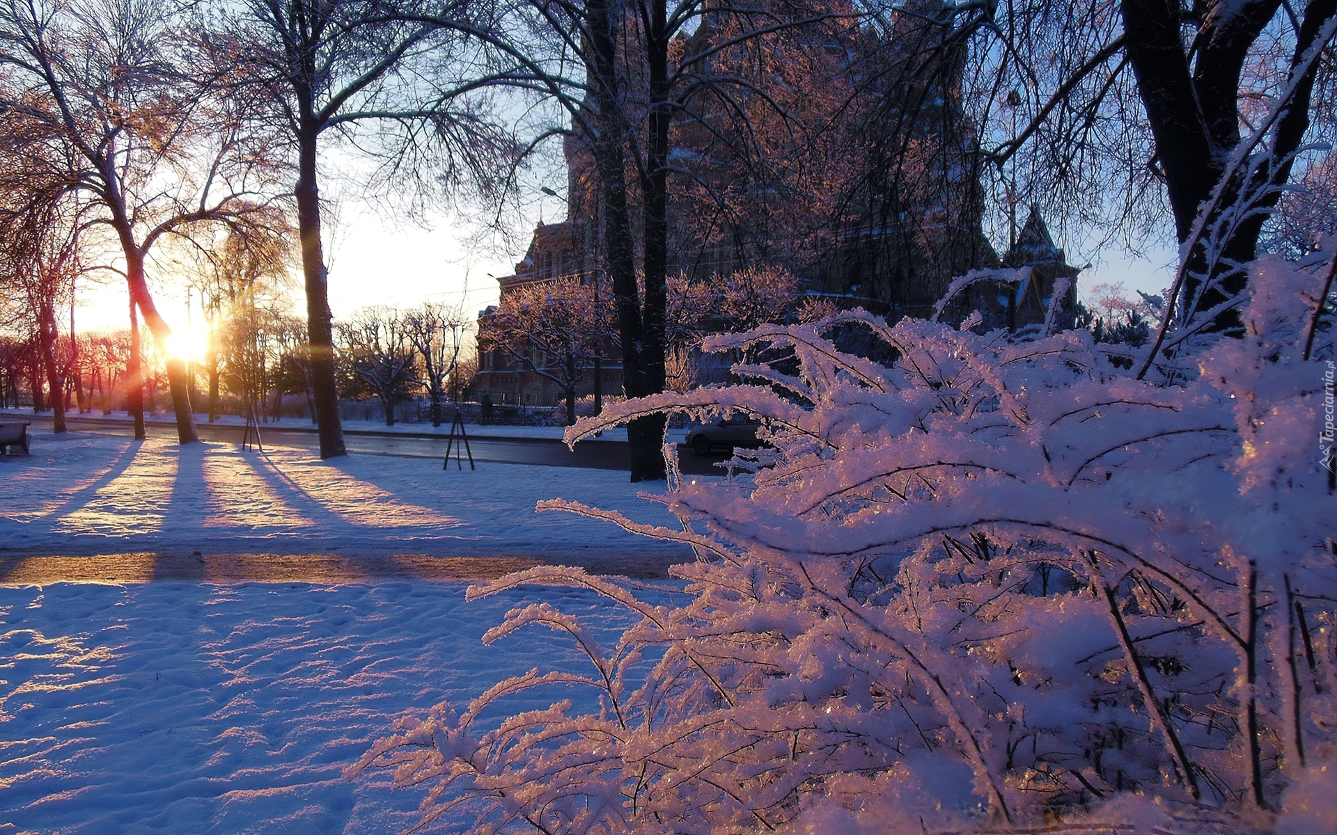 Edytor tapety: Zima, Śnieg, Dom, Drzewa, Krzewy, Promienie, Słońca