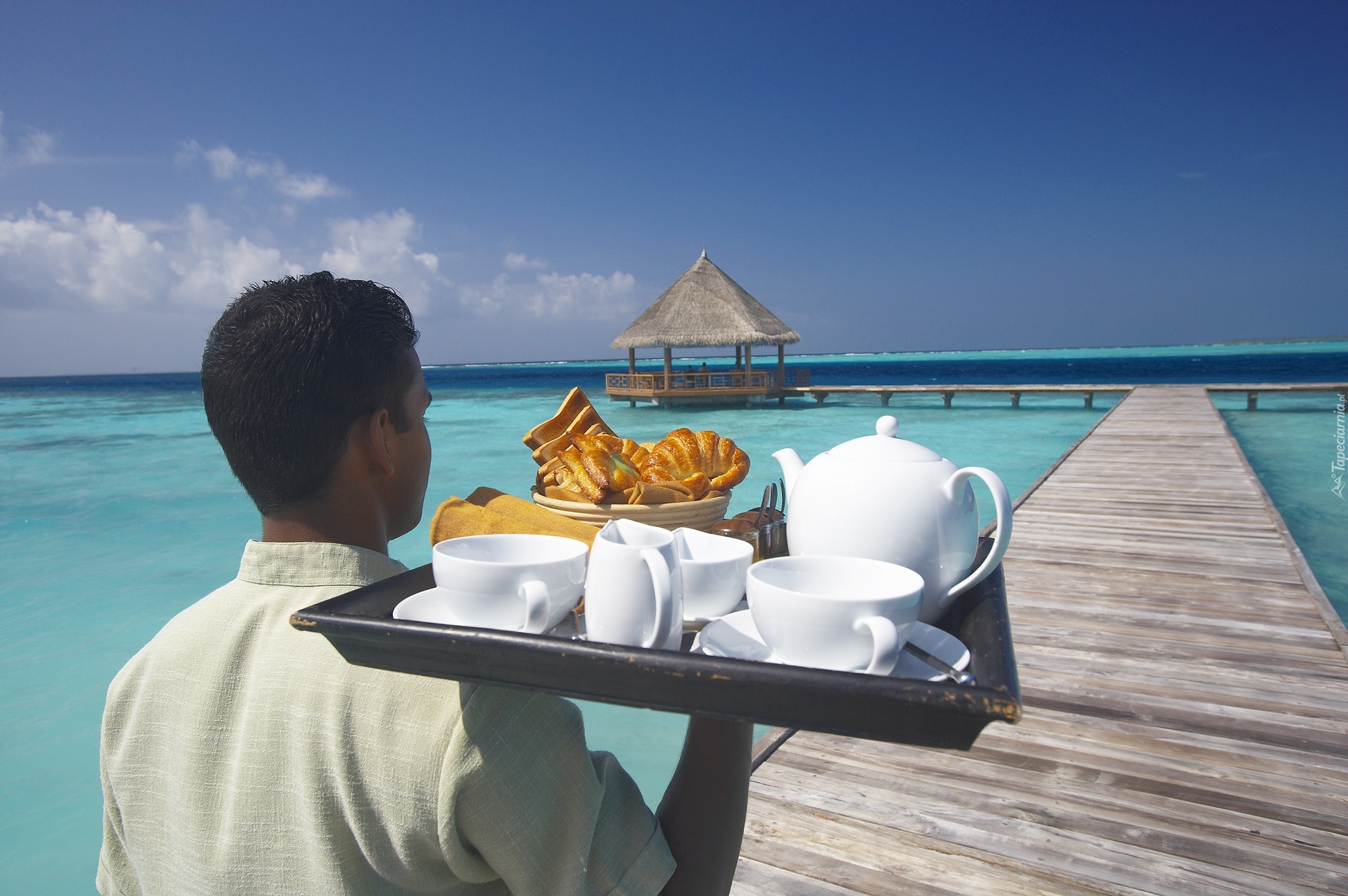 Edytor tapety: Morze, Molo, Mężczyzna, Taca, Filiżanki