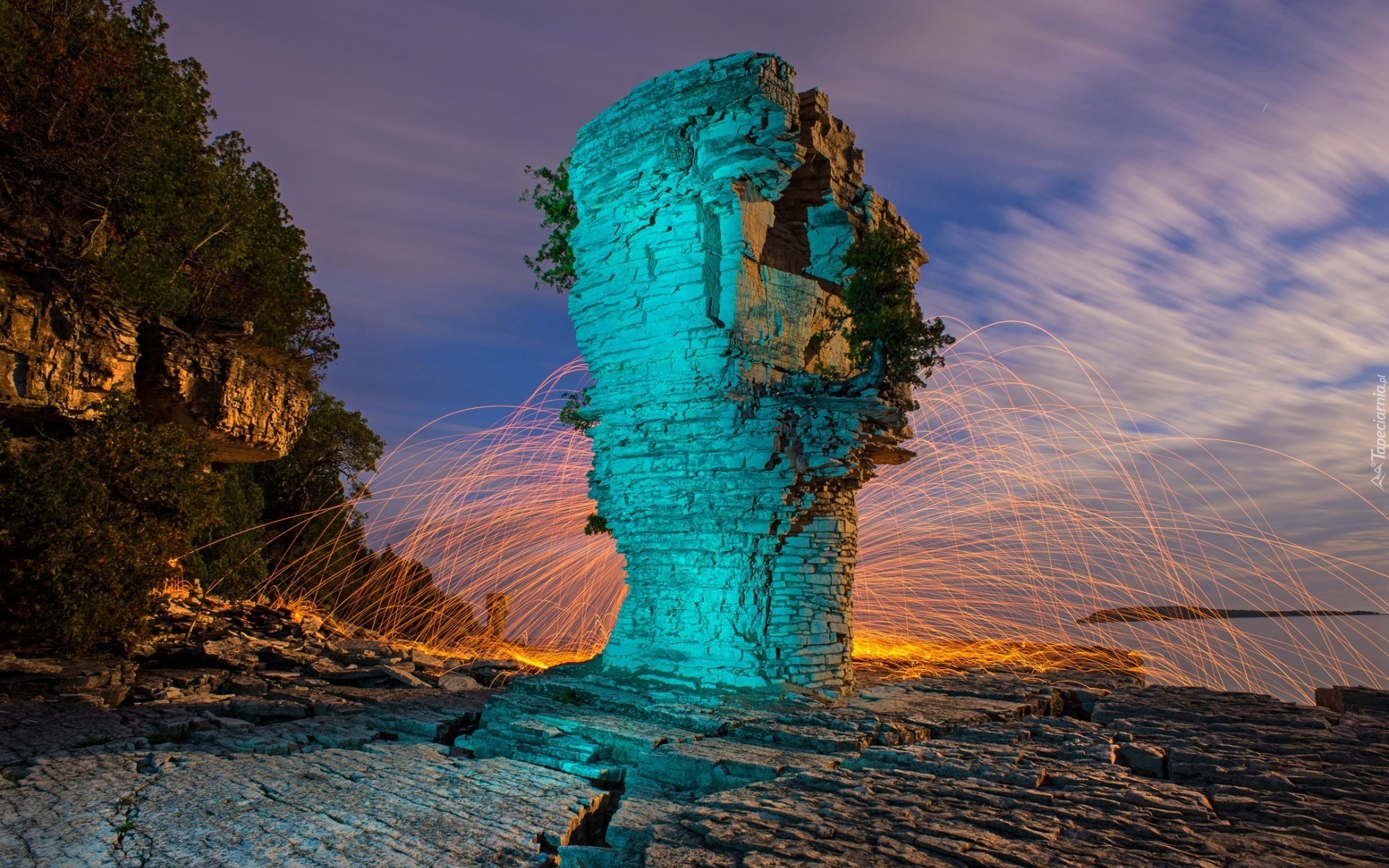 Edytor tapety: Jezioro, Skały, Zachód, Słońca, Drzewa