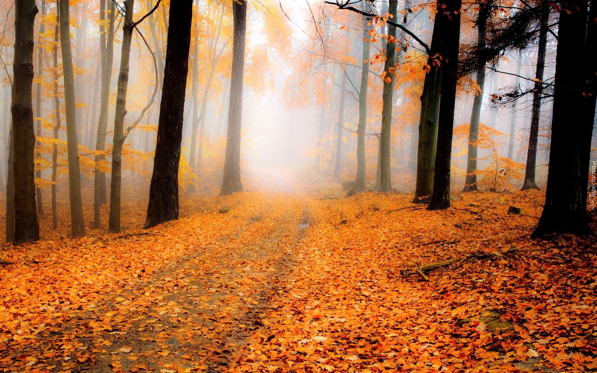 Edytor tapety: Las, Droga, Drzewa, Liście, Mgła, Jesień