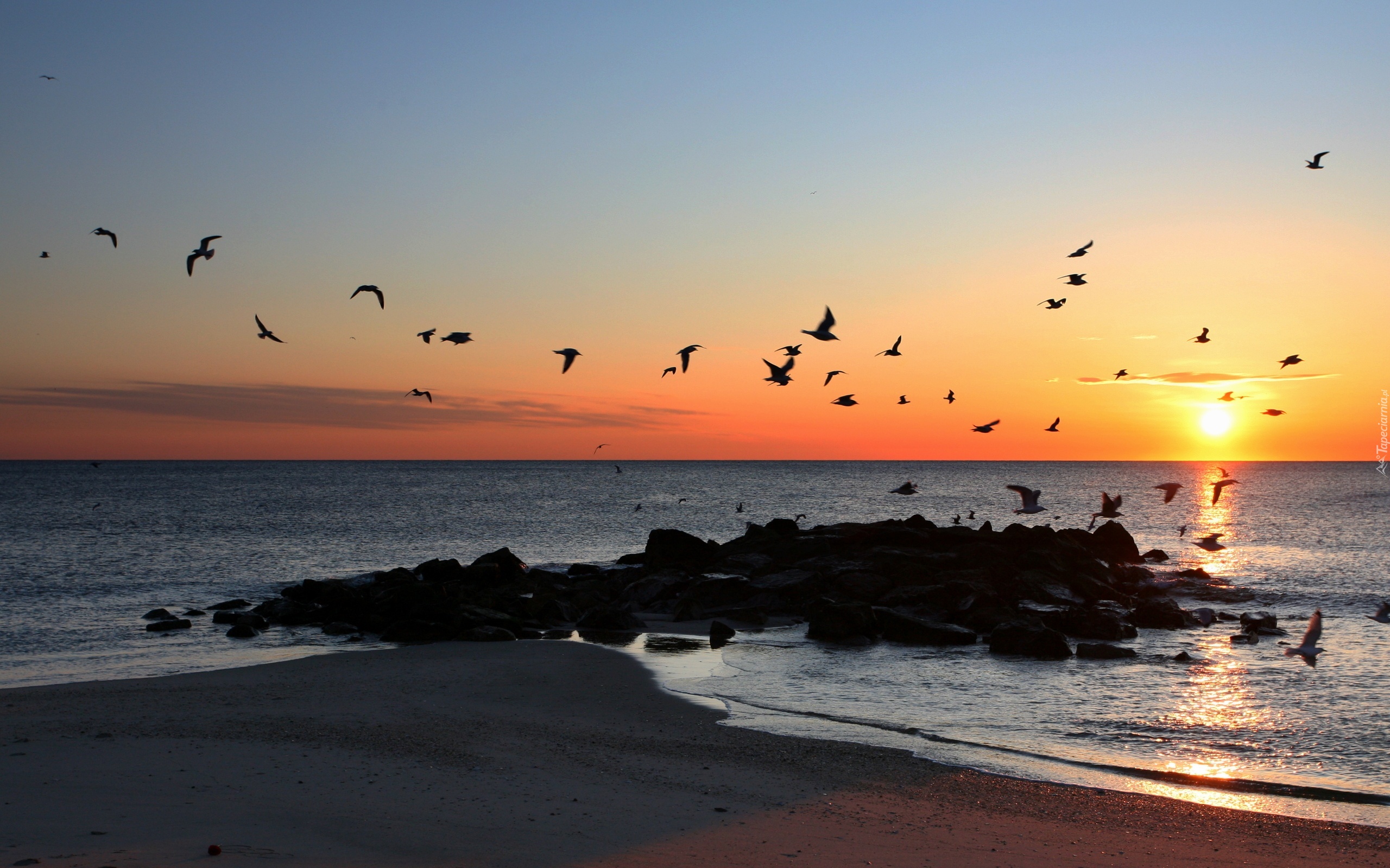 Edytor tapety: Plaża, Morze, Kamienie, Ptaki, Wschód, Słońca