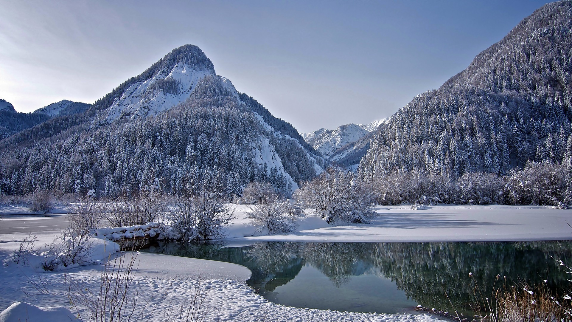 Edytor tapety: Zima, Góry, Las, Jezioro, Odbicie