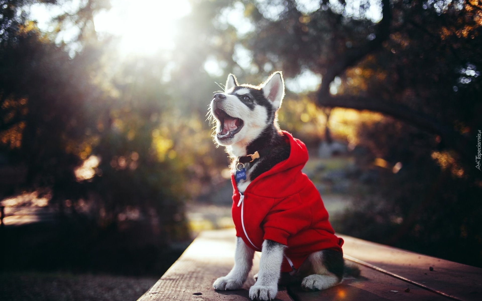 Edytor tapety: Husky, Szczeniaczek, Ubranko, Ławka, Park