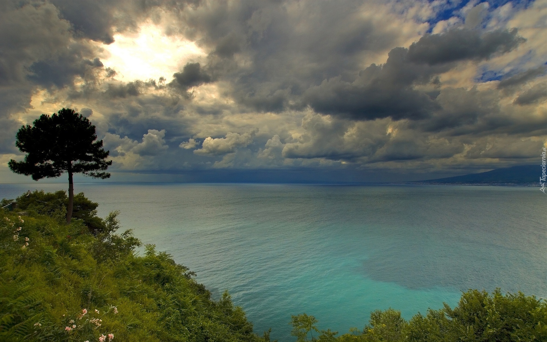 Edytor tapety: Wybrzeże, Drzewo, Morze, Chmury, Przebijające, Światło