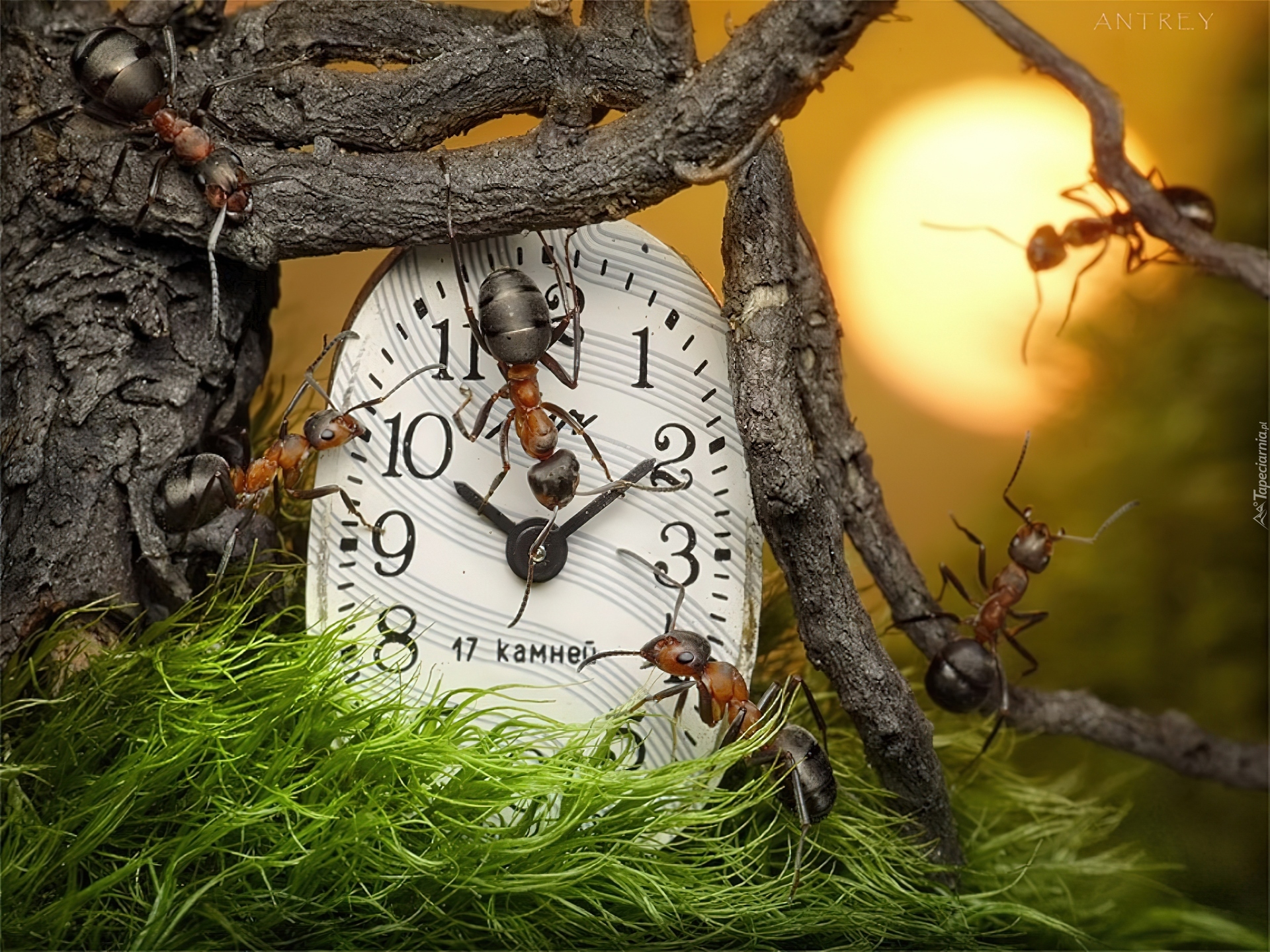 Edytor tapety: Mrówki, Zegar, Konar, Trawa