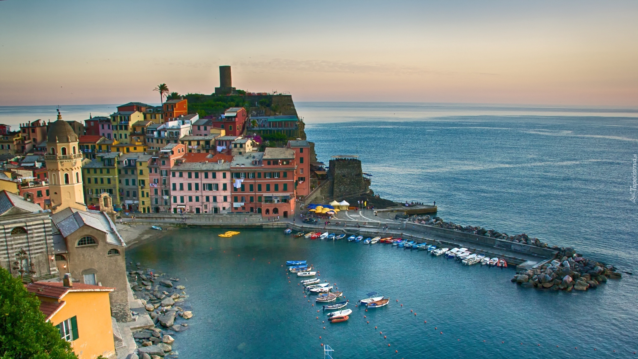 Edytor tapety: Włochy, Morze, Liguryjskie, Wzgórze, Vernazza, Domy, Łodzie
