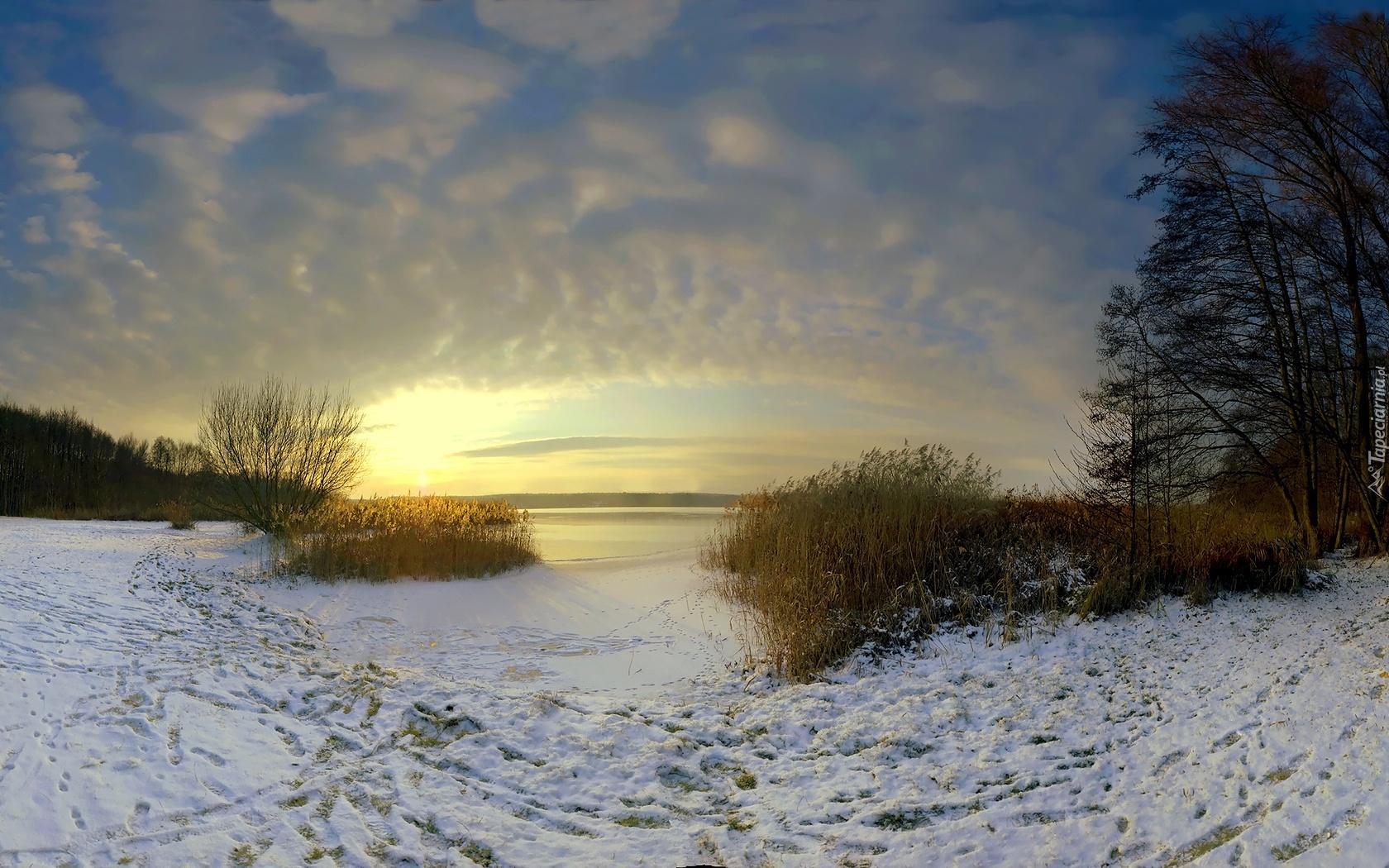 Edytor tapety: Jezioro, Lasy, Trawy, Zachód, Słońca, Zima