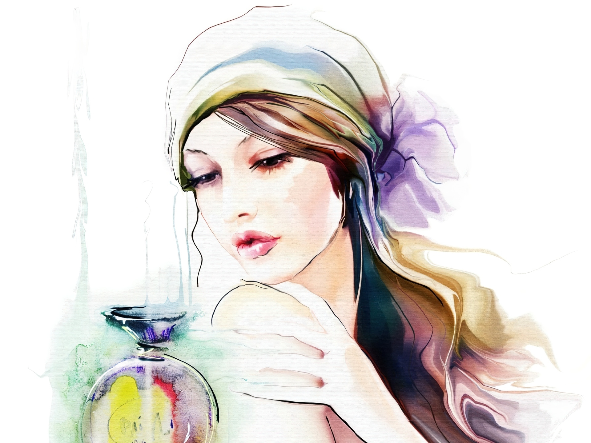 Edytor tapety: Kobieta, Chusta, Perfumy, Akwarela, Obraz