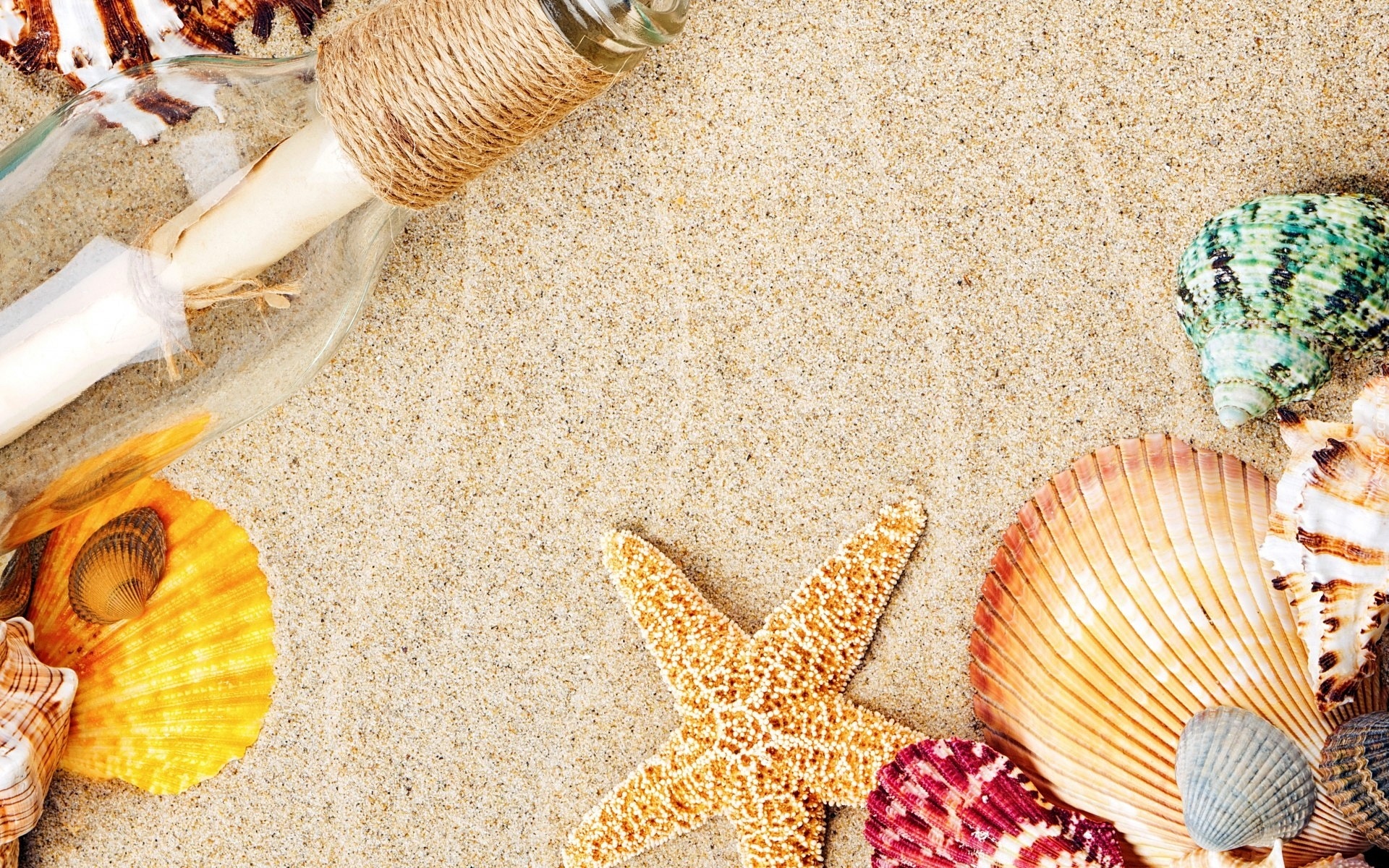 Edytor tapety: Kolorowe, Muszle, Butelka, Plaża, Piasek