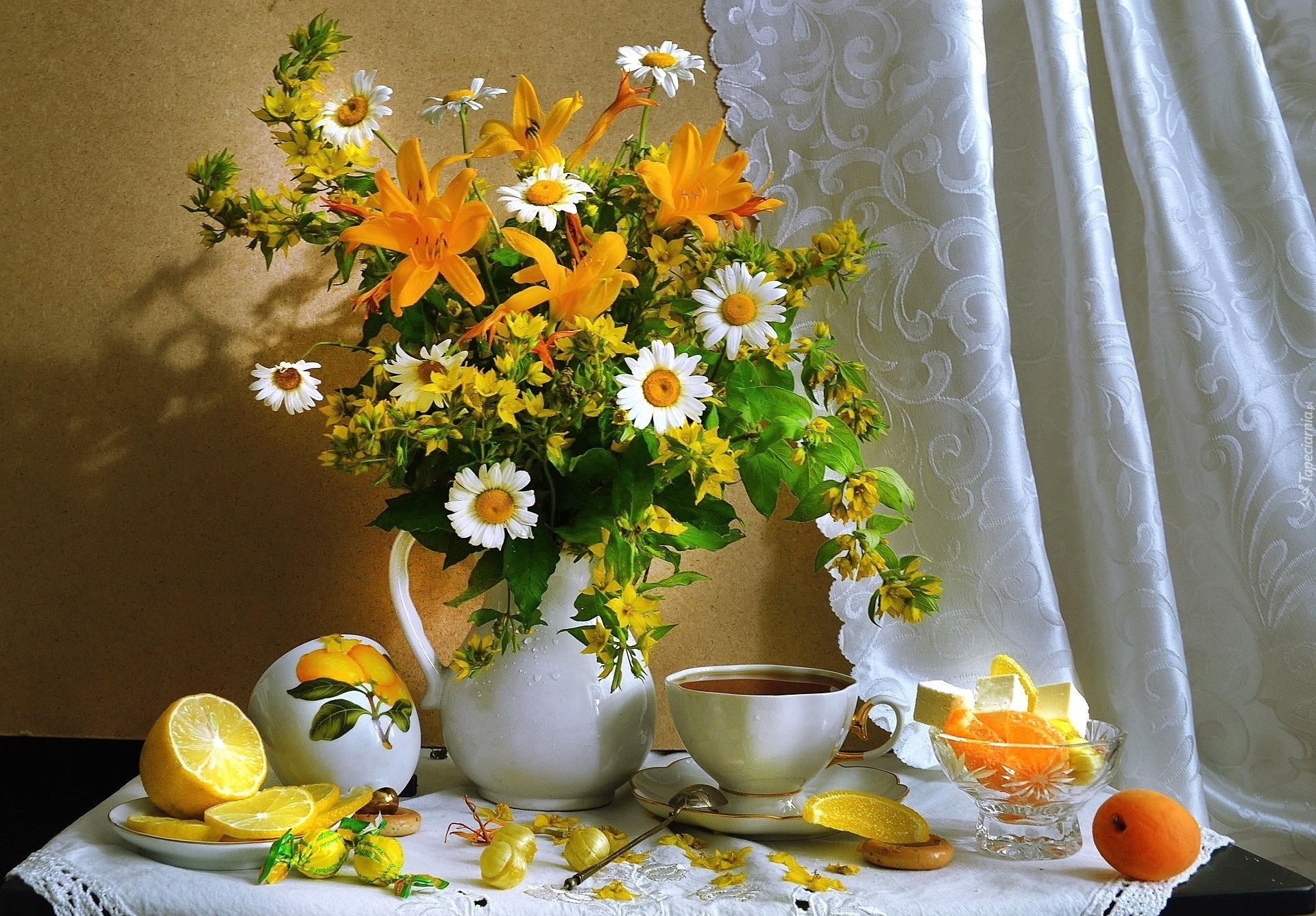 Edytor tapety: Bukiet Kwiatów, Wazon, Filiżanka, Kompozycja