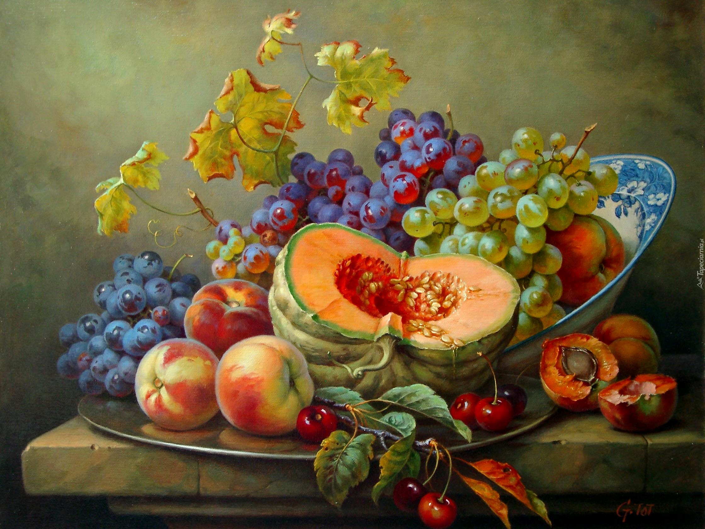 Edytor tapety: Winogrona, Dynia, Brzoskwinie, Obraz, Olej
