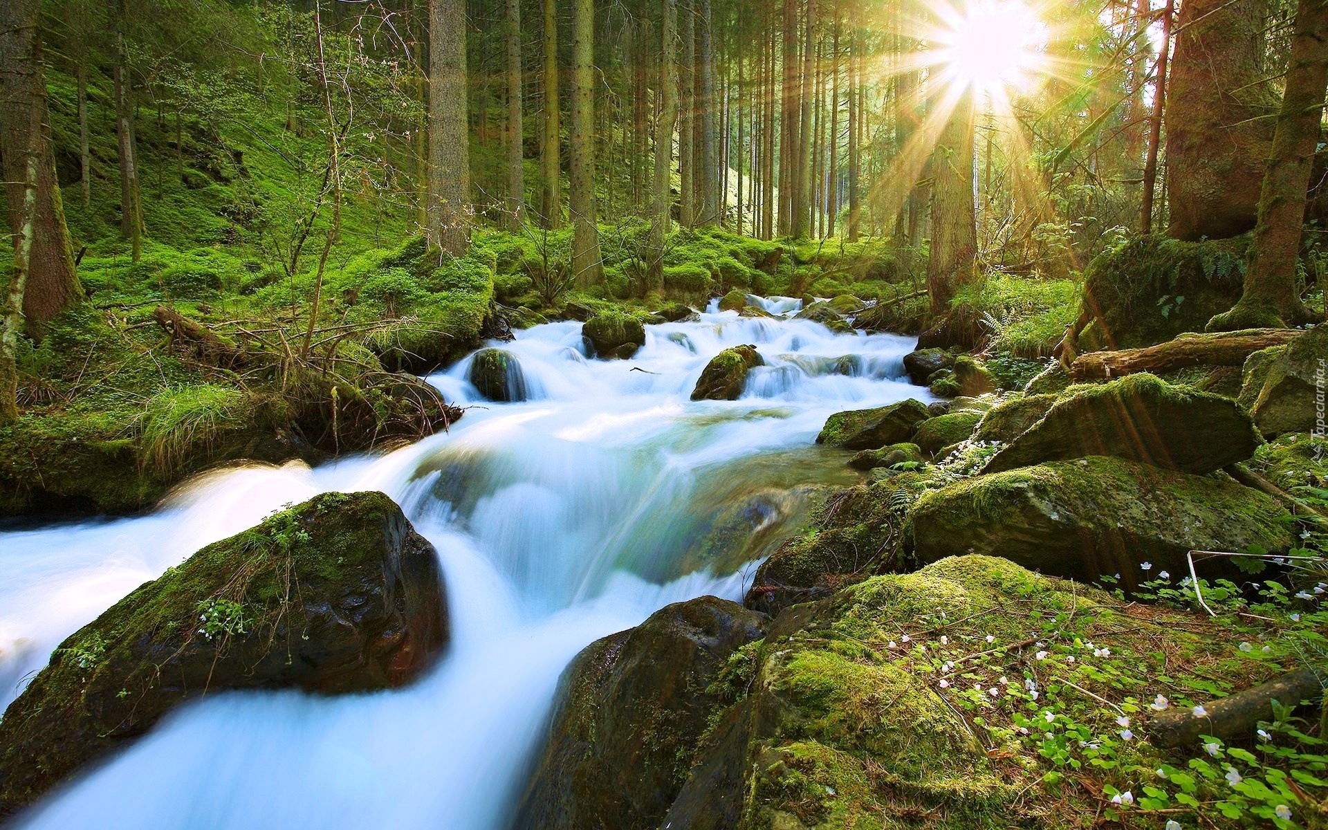 Edytor tapety: Las, Rzeka, Kamienie, Przebijające Światło