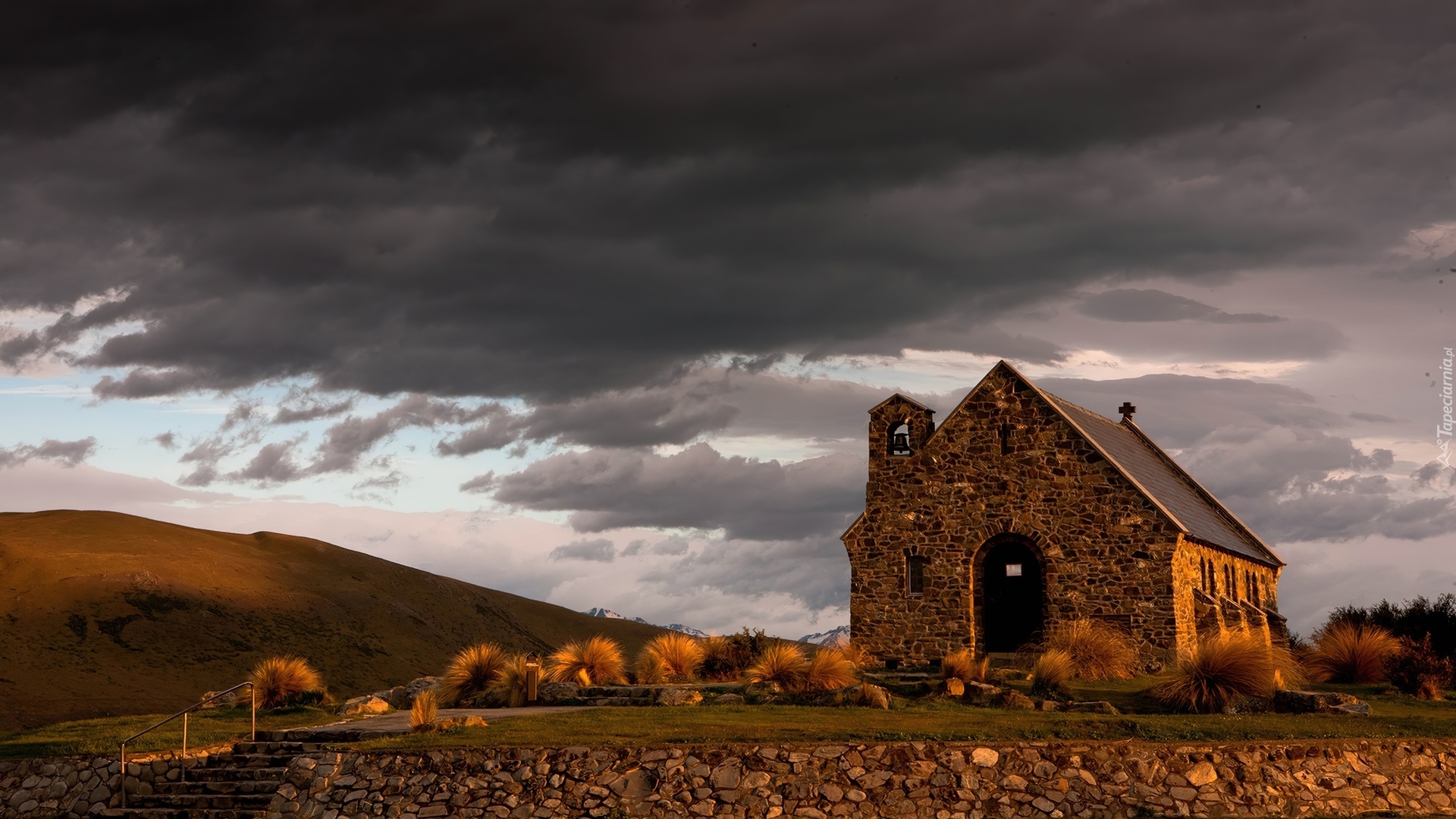 Edytor tapety: Kościół, Pola, Chmury, Rośliny