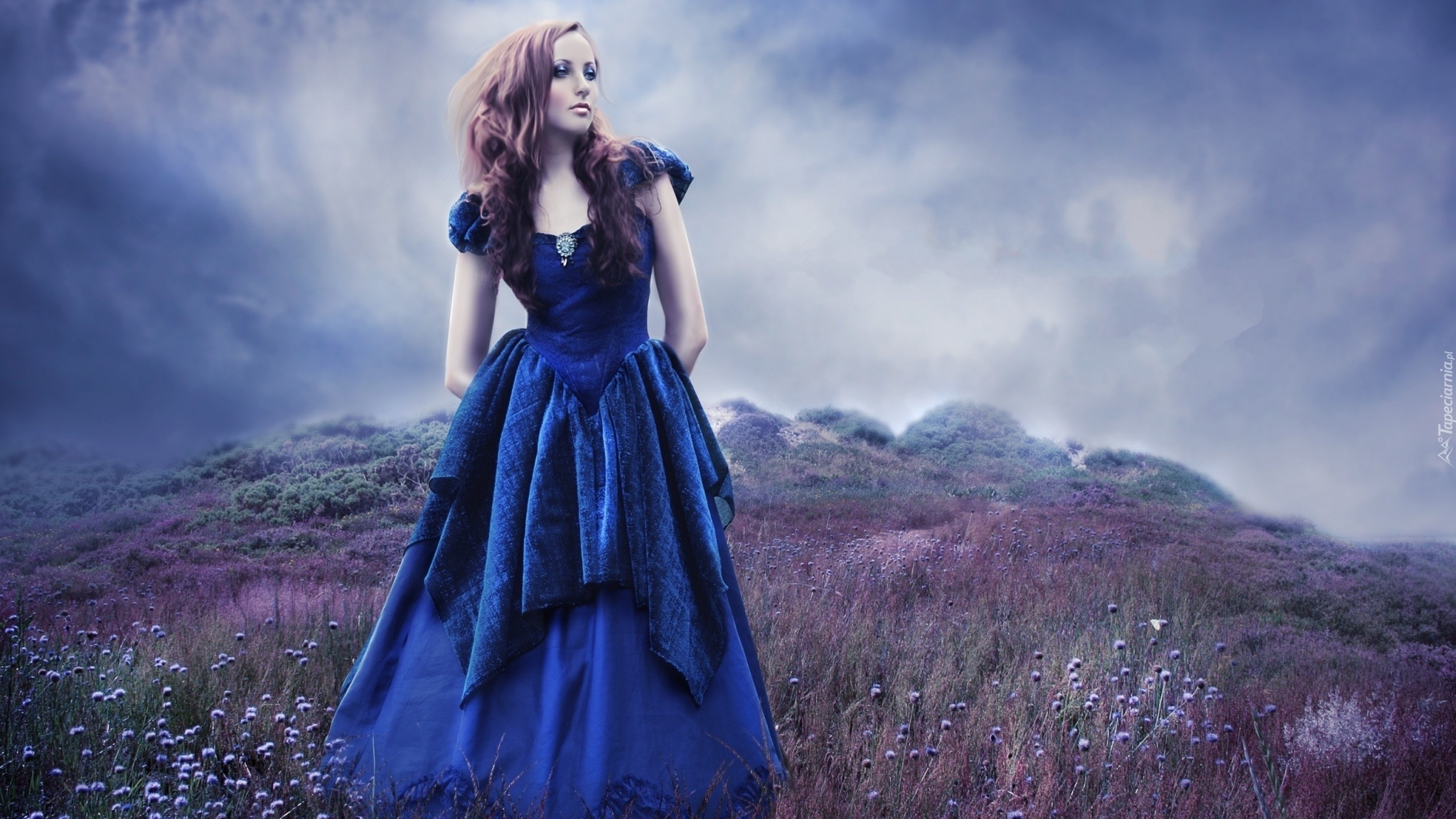 Edytor tapety: Kobieta, Niebieska, Suknia, Pole, Kwiaty, Makijaż, Niebo