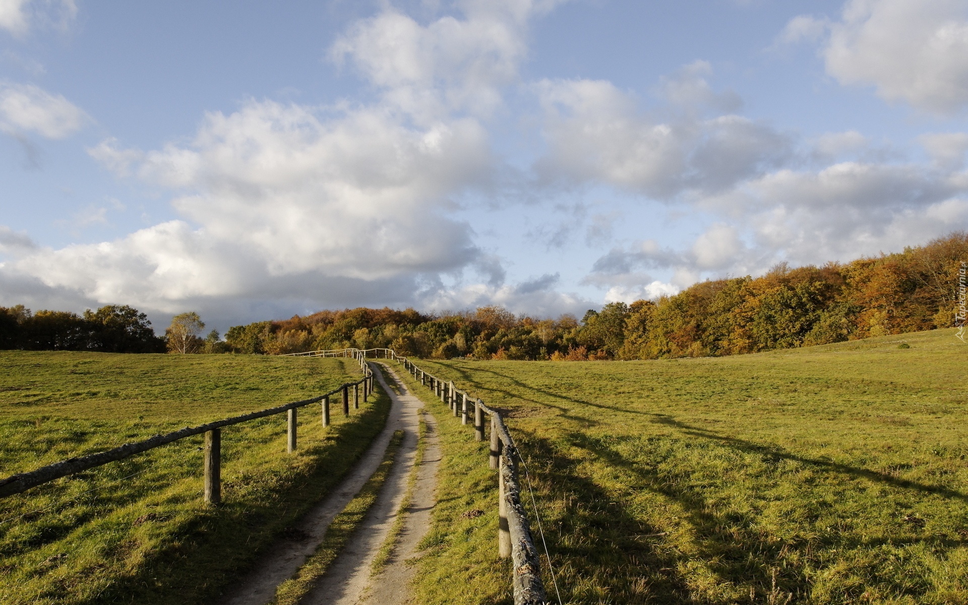 Edytor tapety: Pole, Droga, Płot, Chmury, Drzewa