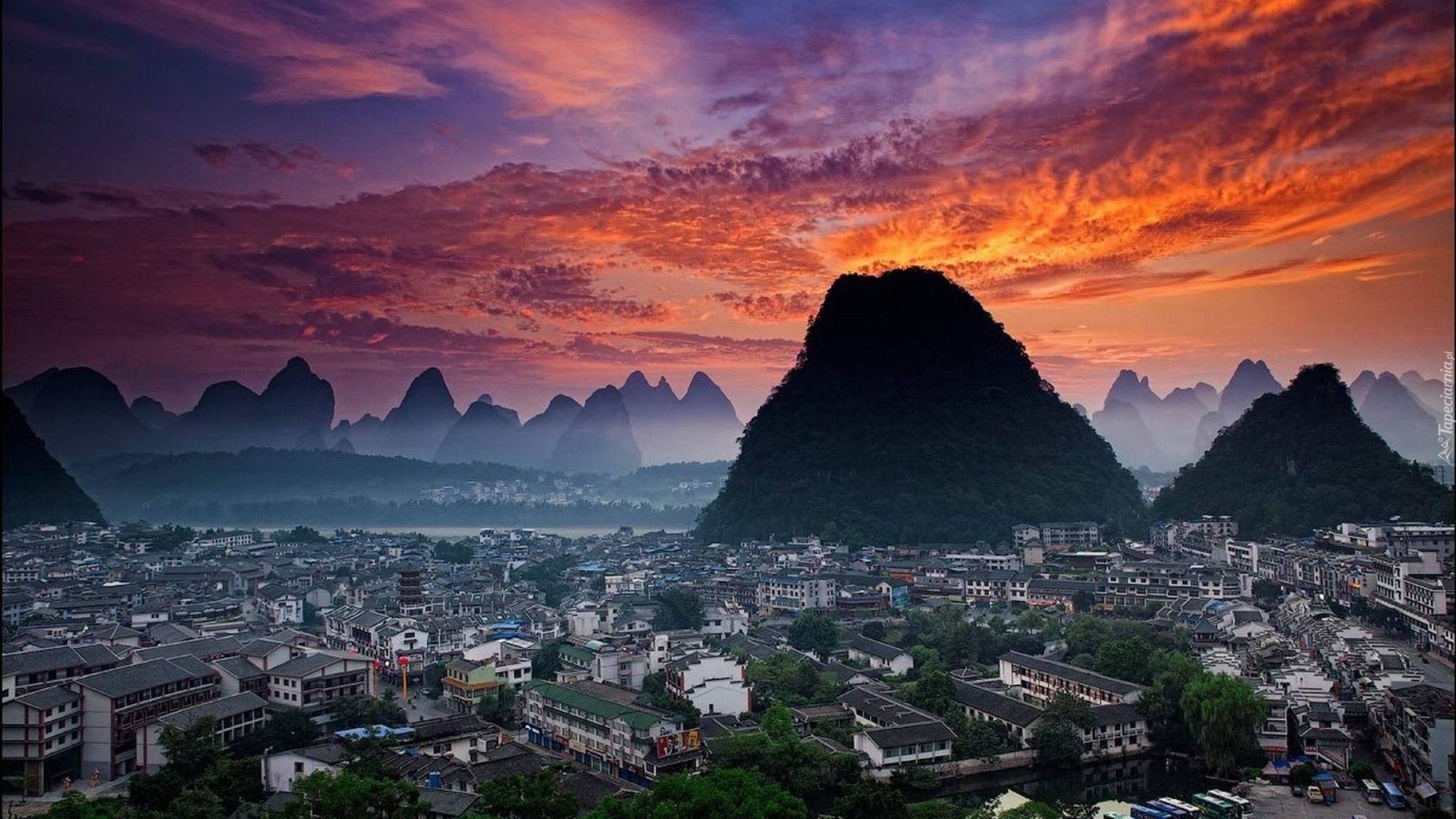 Edytor tapety: Panorama, Miasta, Góry, Mgła, Zachód, Słońca, Wieczór, Yangshu, Chiny