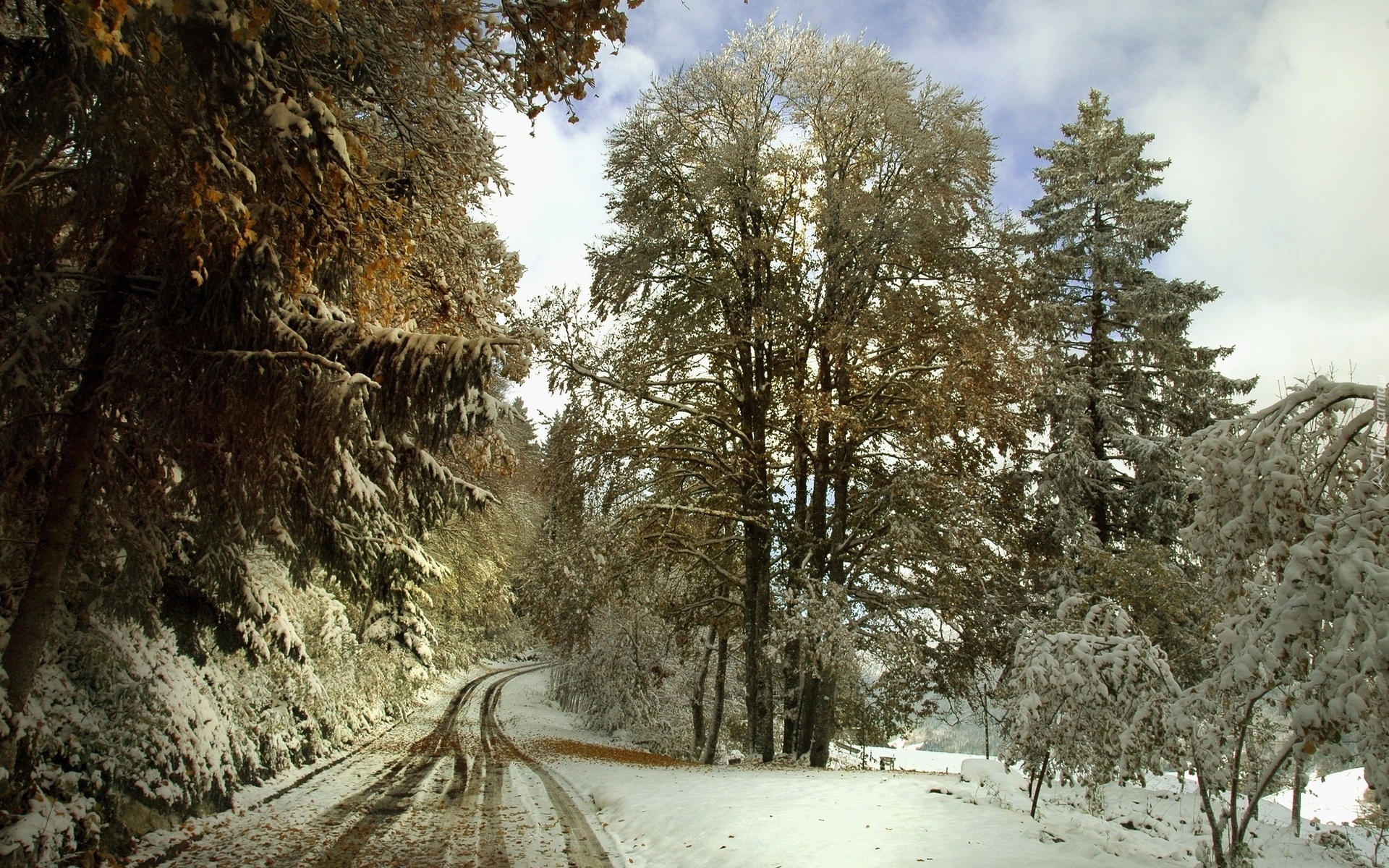 Edytor tapety: Droga, Góry, Las, Drzewa, Zima