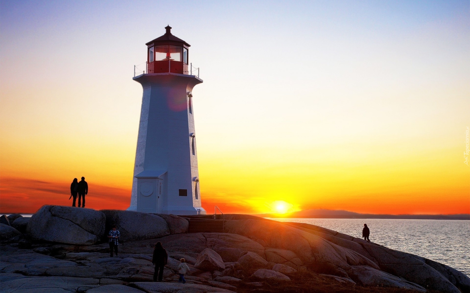 Edytor tapety: Latarnia, Morska, Skały, Ludzie, Morze, Promienie, Słońca