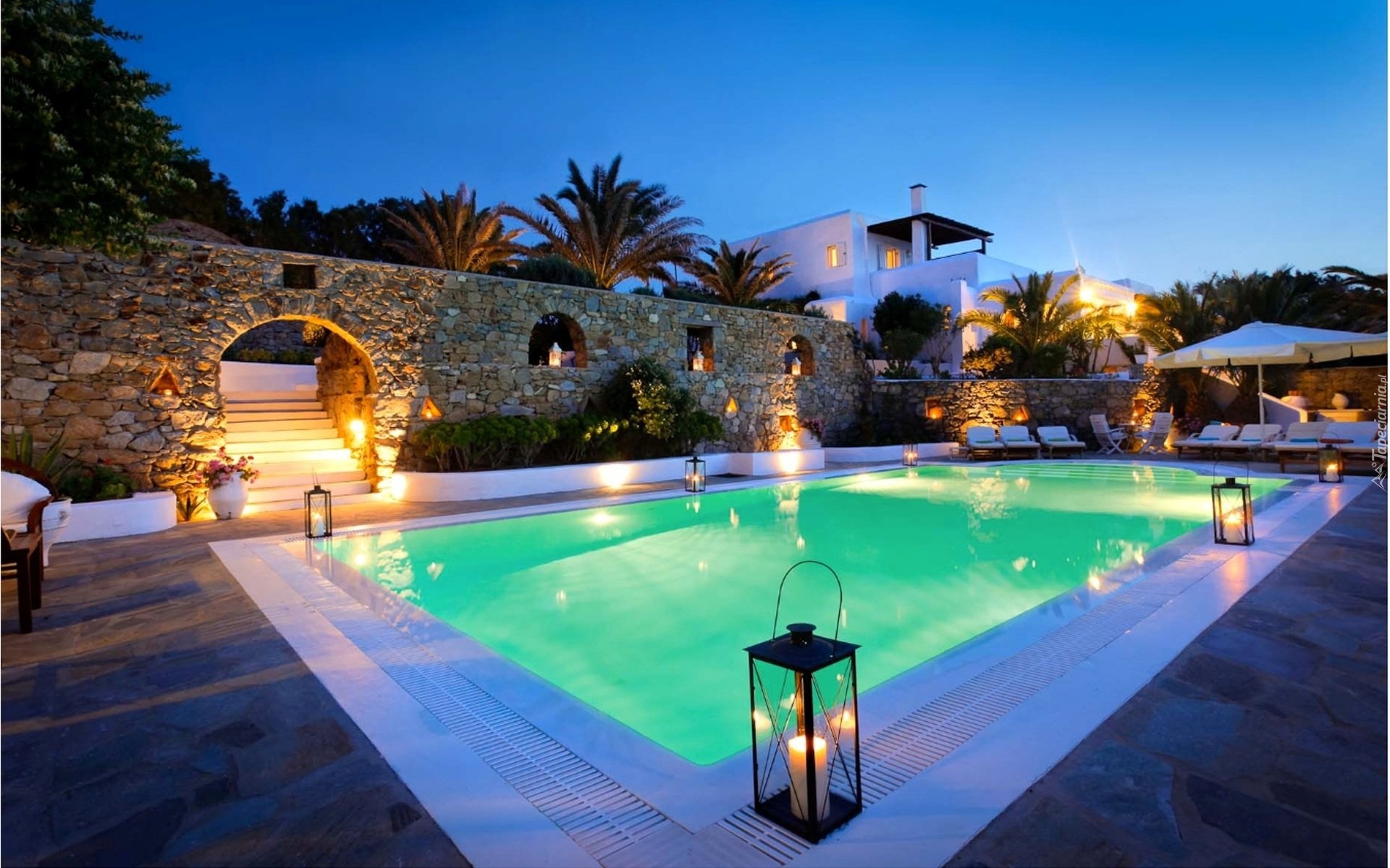 Edytor tapety: Willa, Basen, Lampiony, Palmy, Leżaki, Lato