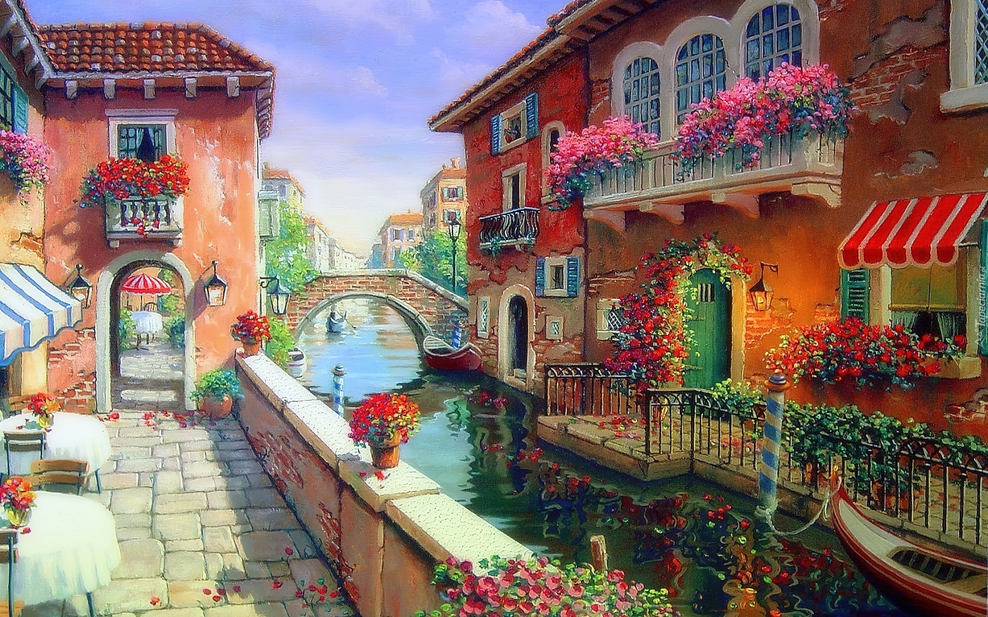 Edytor tapety: Kanał, Gondole, Domy, Kwiaty, Wenecja, Obraz