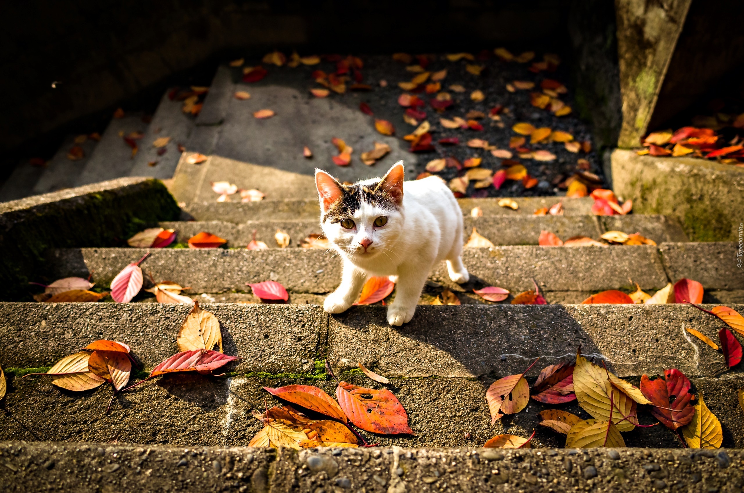 Edytor tapety: Kotek, Schody, Liście, Jesień