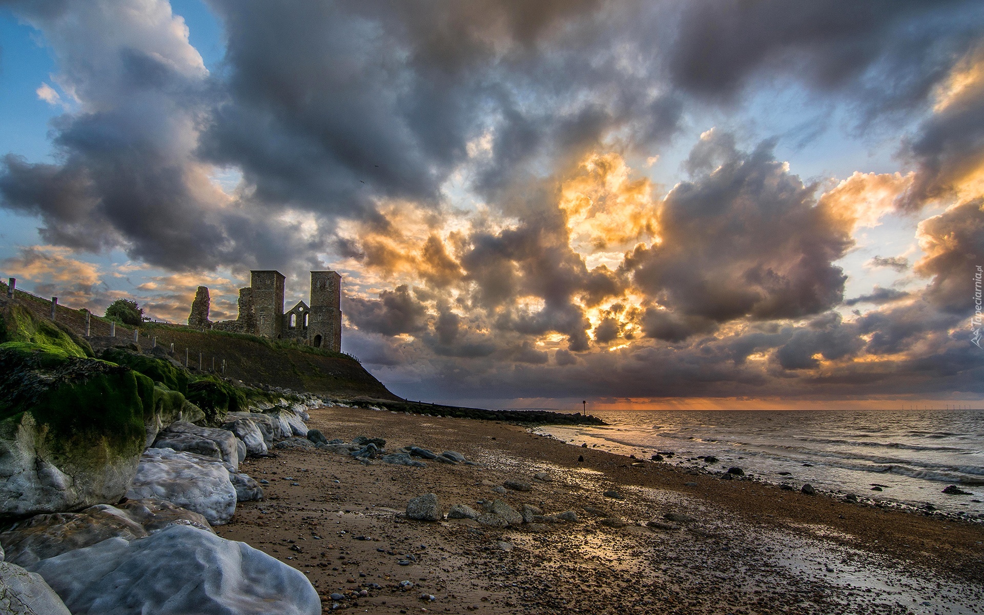 Edytor tapety: Morze, Plaża, Kamienie, Ruiny, Chmury, Zachód, Słońca