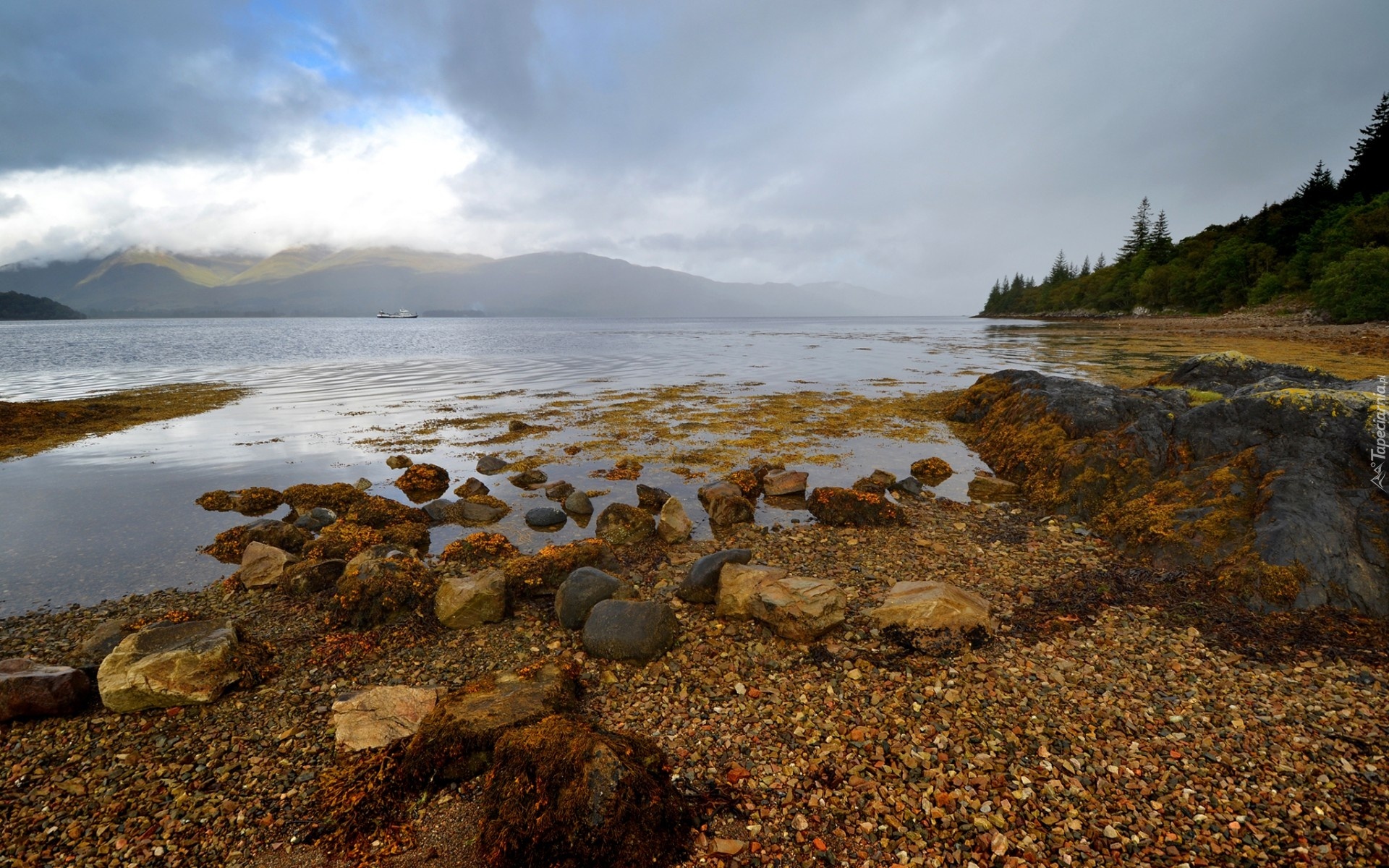 Edytor tapety: Jezioro, Kamienie, Statek, Góry, Lasy, Chmury