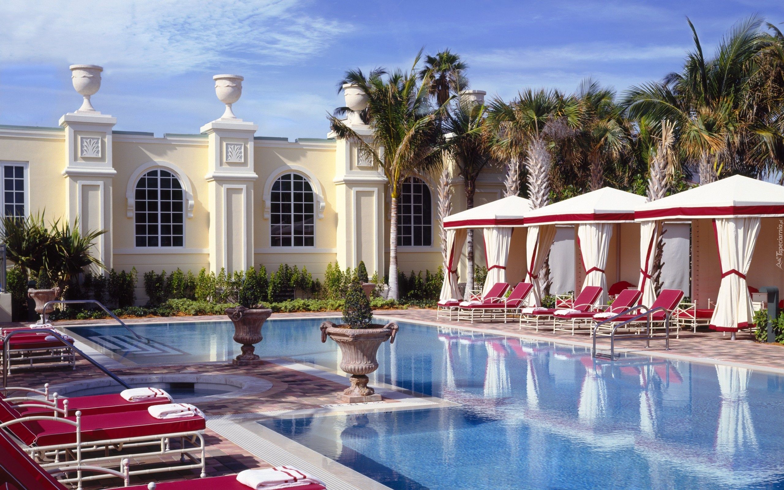 Edytor tapety: Basen, Leżaki, Kwiaty, Palmy, Hotel, Lato, Wakacje