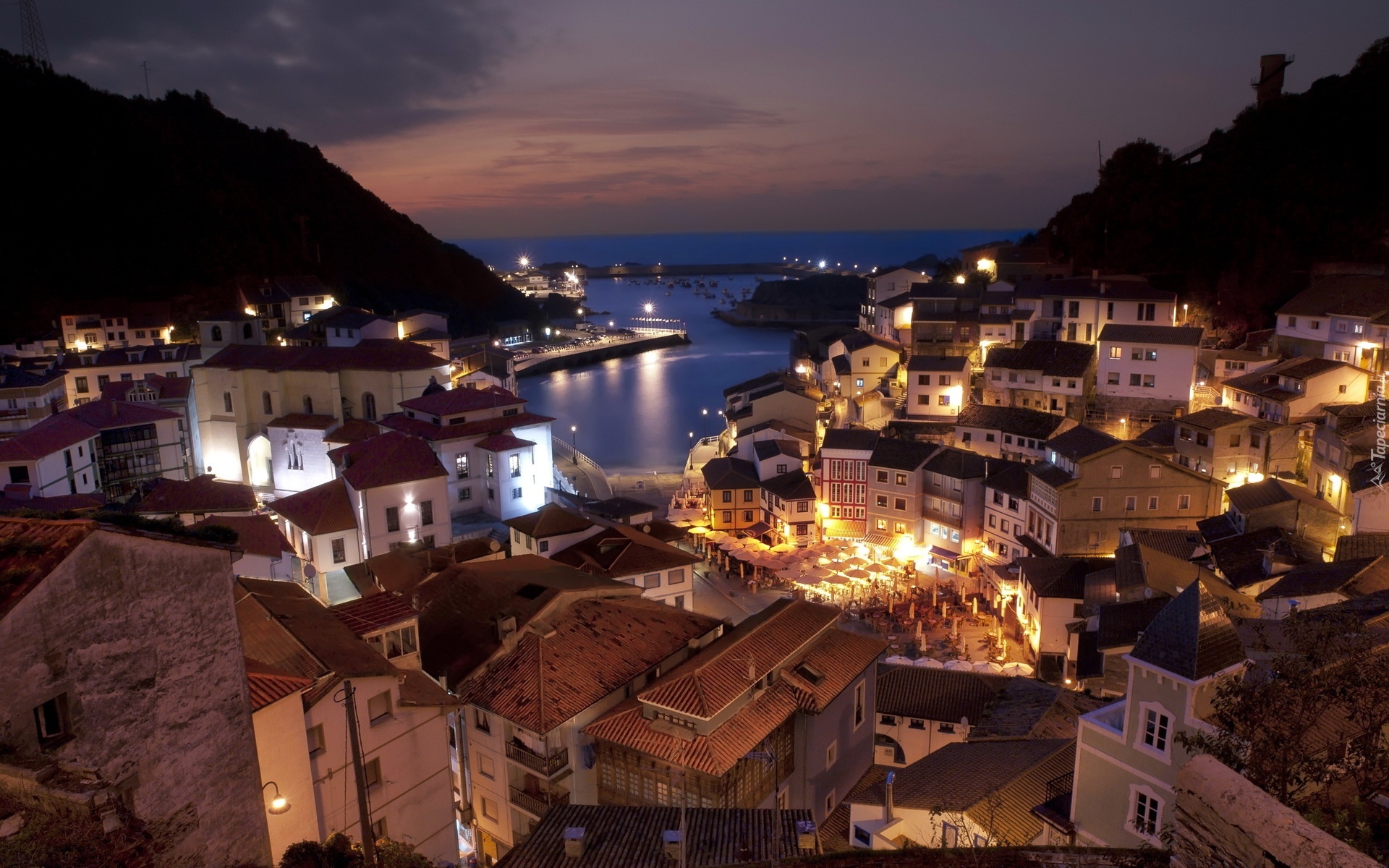 Edytor tapety: Domy, Panorama, Miasta, Góry, Zatoka, Morze, Hiszpania, Noc