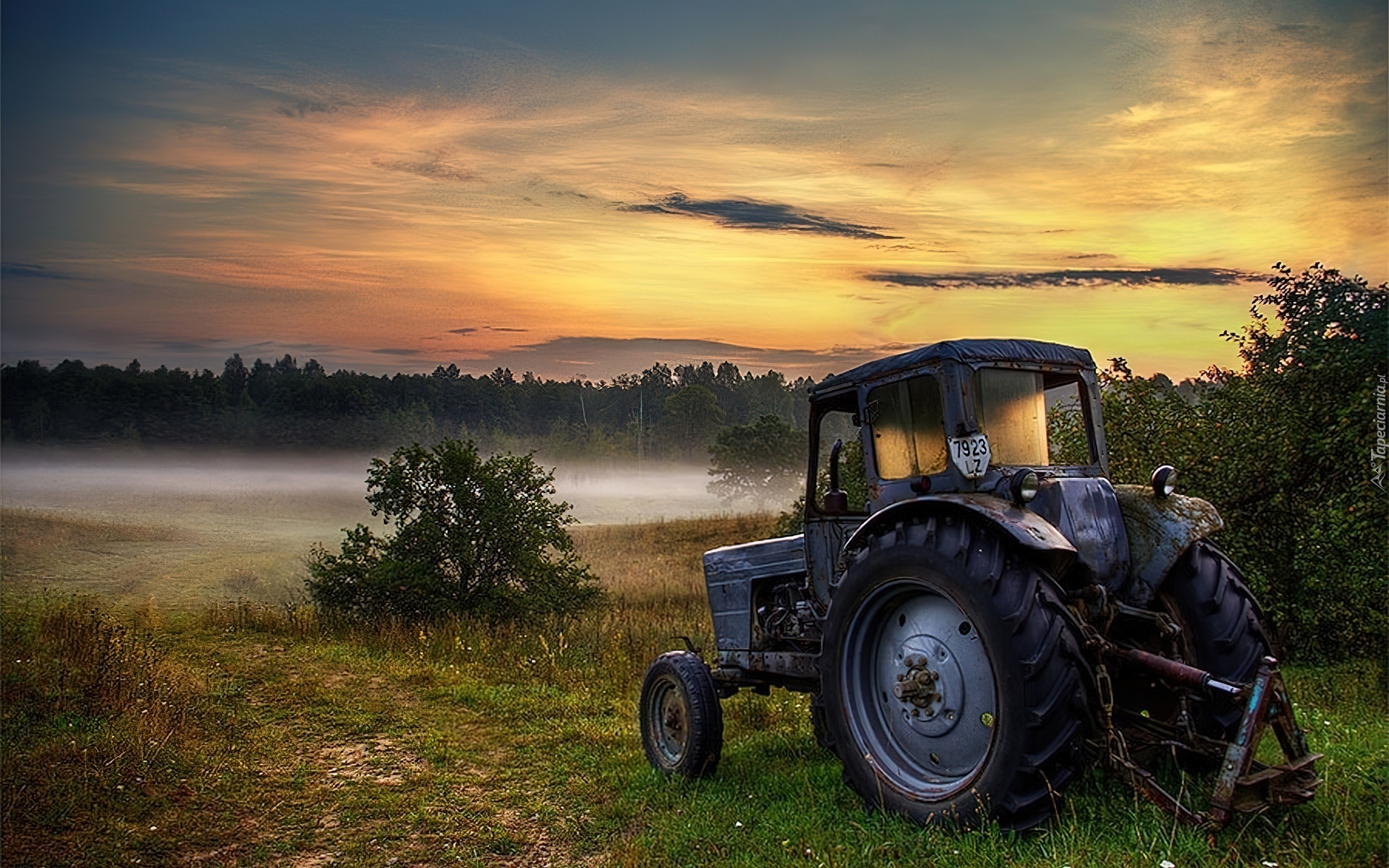 Edytor tapety: Ciągnik, Rolniczy, Zachód, Słońca, Łąka, Mgła