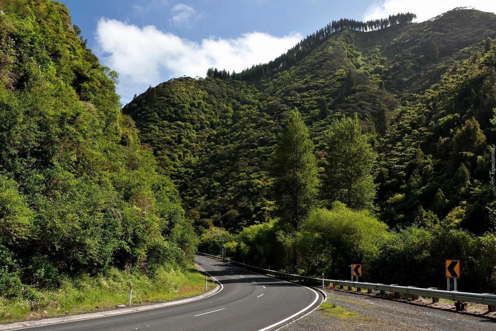 Edytor tapety: Góry, Las, Droga, Zakręt, Obłoki