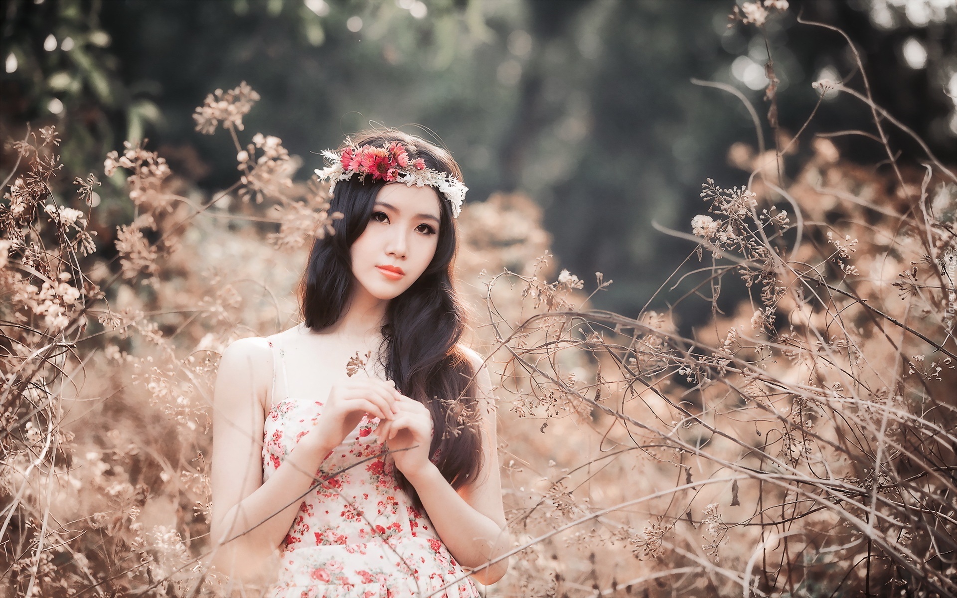 Edytor tapety: Brunetka, Dziewczyna, Wianek, Trawy