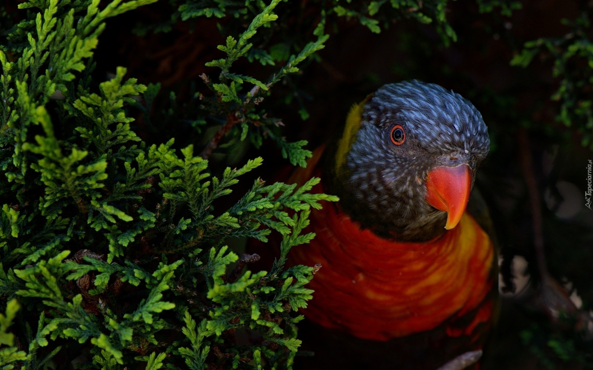 Edytor tapety: Papuga, Gałązki, Tuji