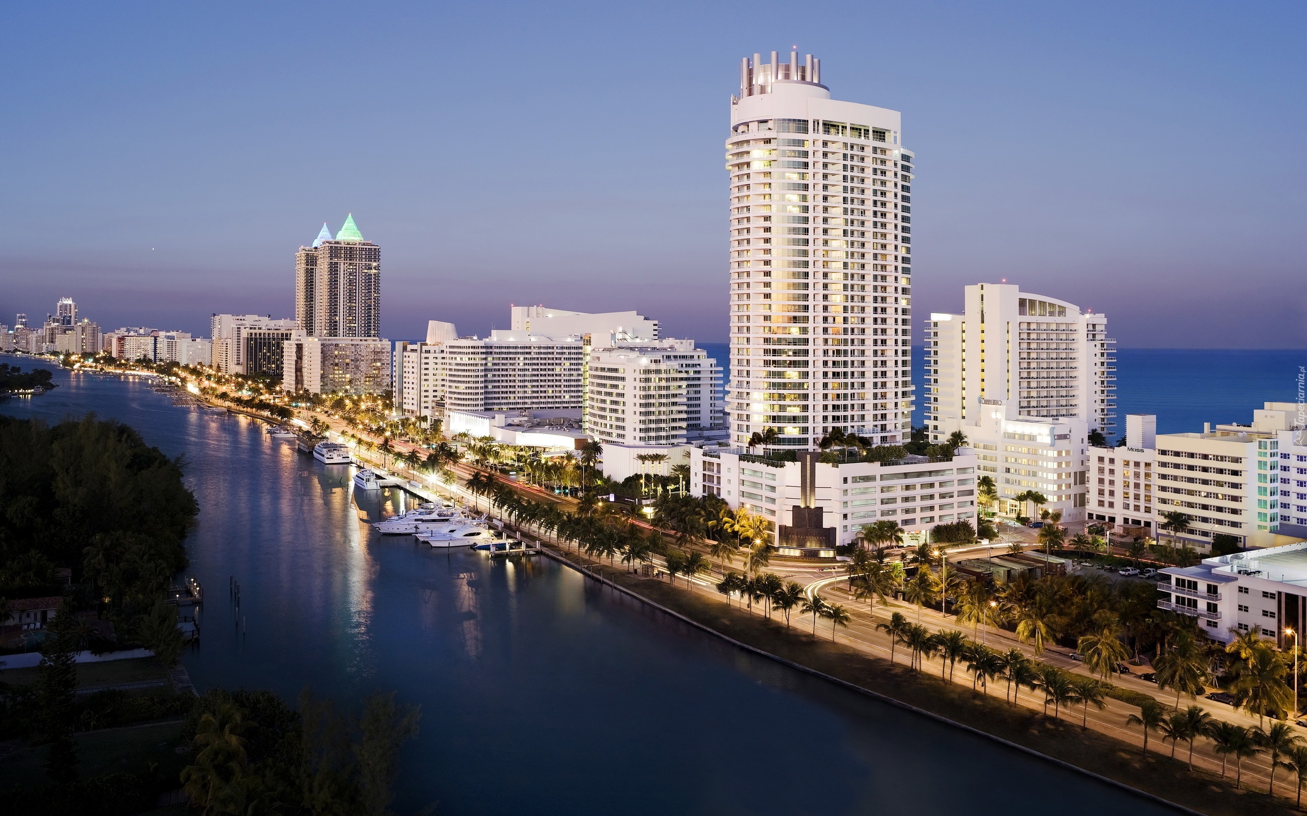 Edytor tapety: Miasto, Miami, Panorama, Palmy, Jachty, Ocean, USA