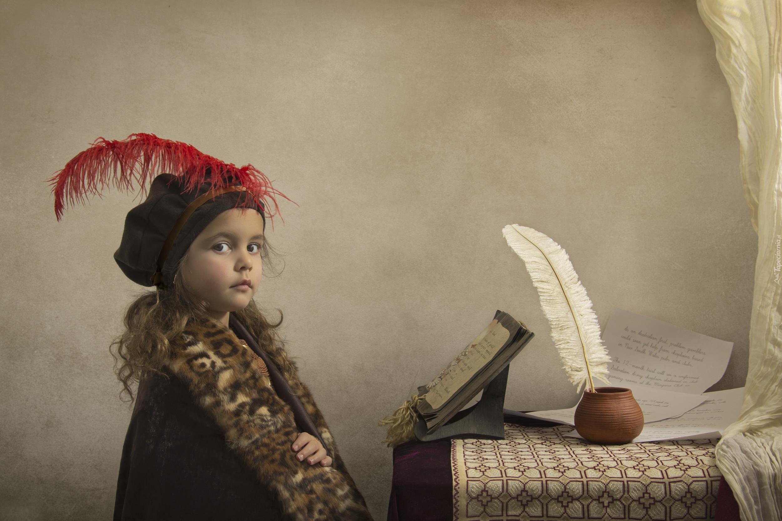 Edytor tapety: Dziewczynka, Czapka, Pióro, Notatki, Kałamarz