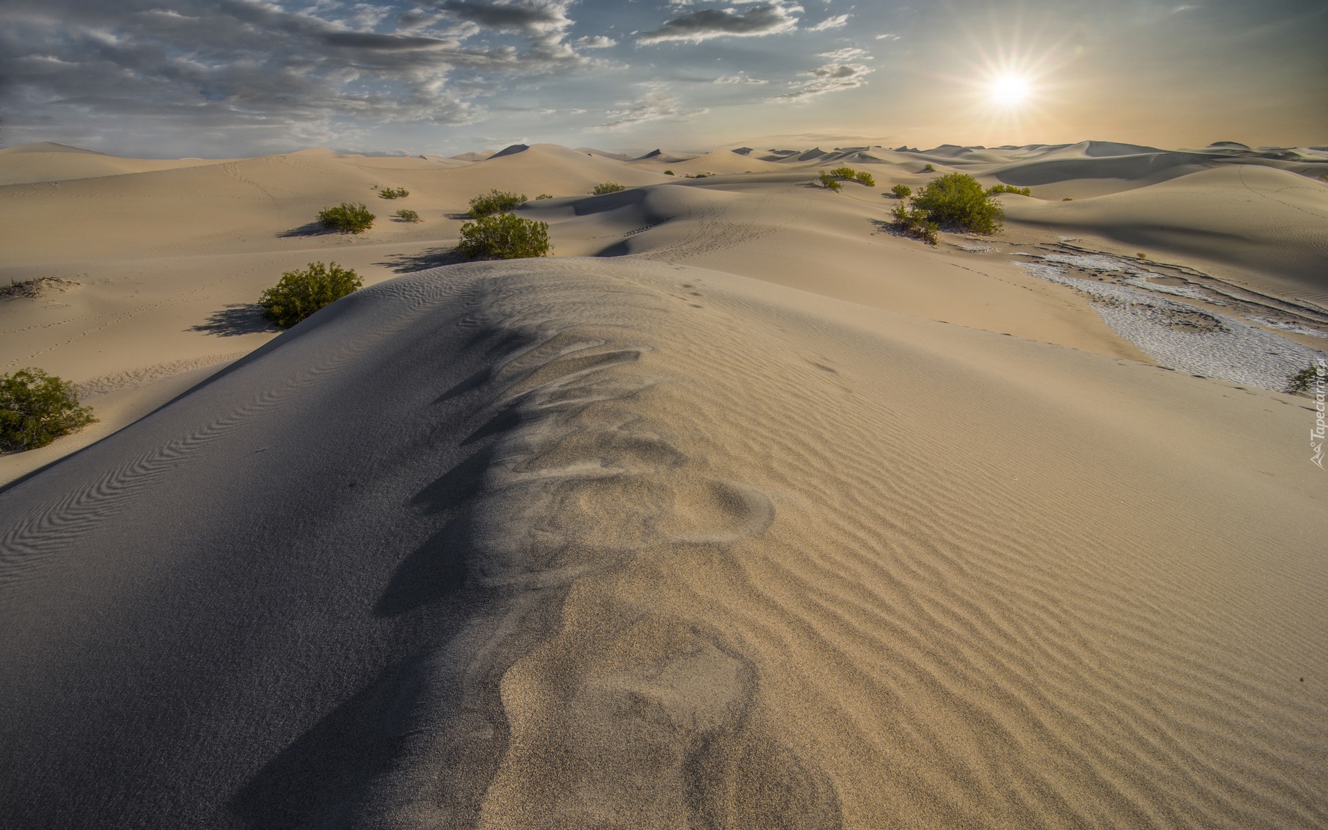 Edytor tapety: Pustynia, Park Narodowy Death Valley, Wydmy, Krzewy, Promienie, Słońca, Kalifornia, Stany Zjednoczone