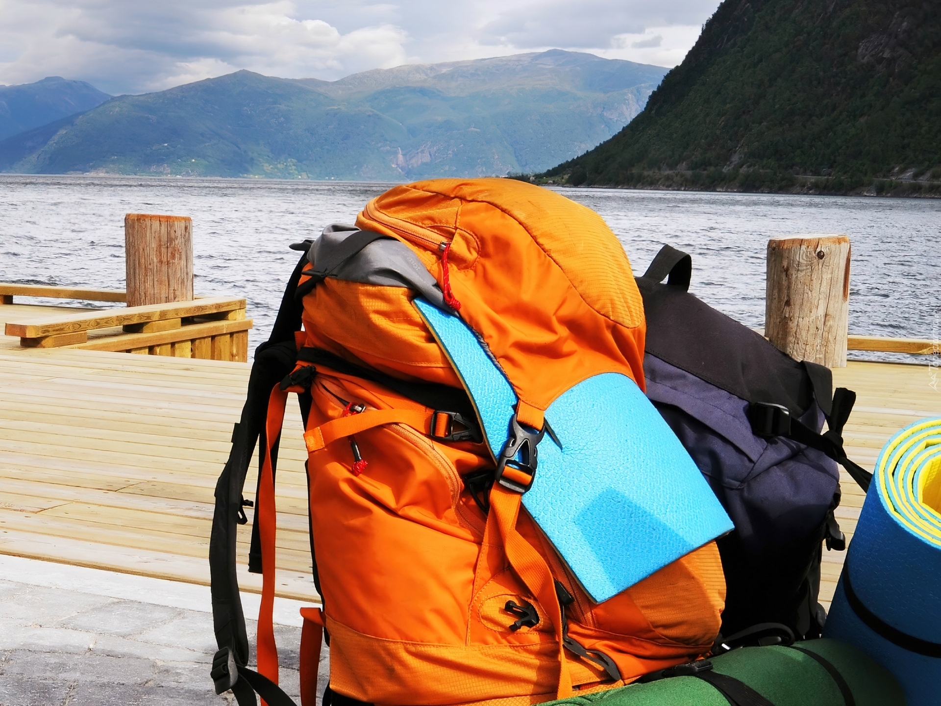 Edytor tapety: Plecak, Molo, Jezioro, Góry, Lato, Wakacje