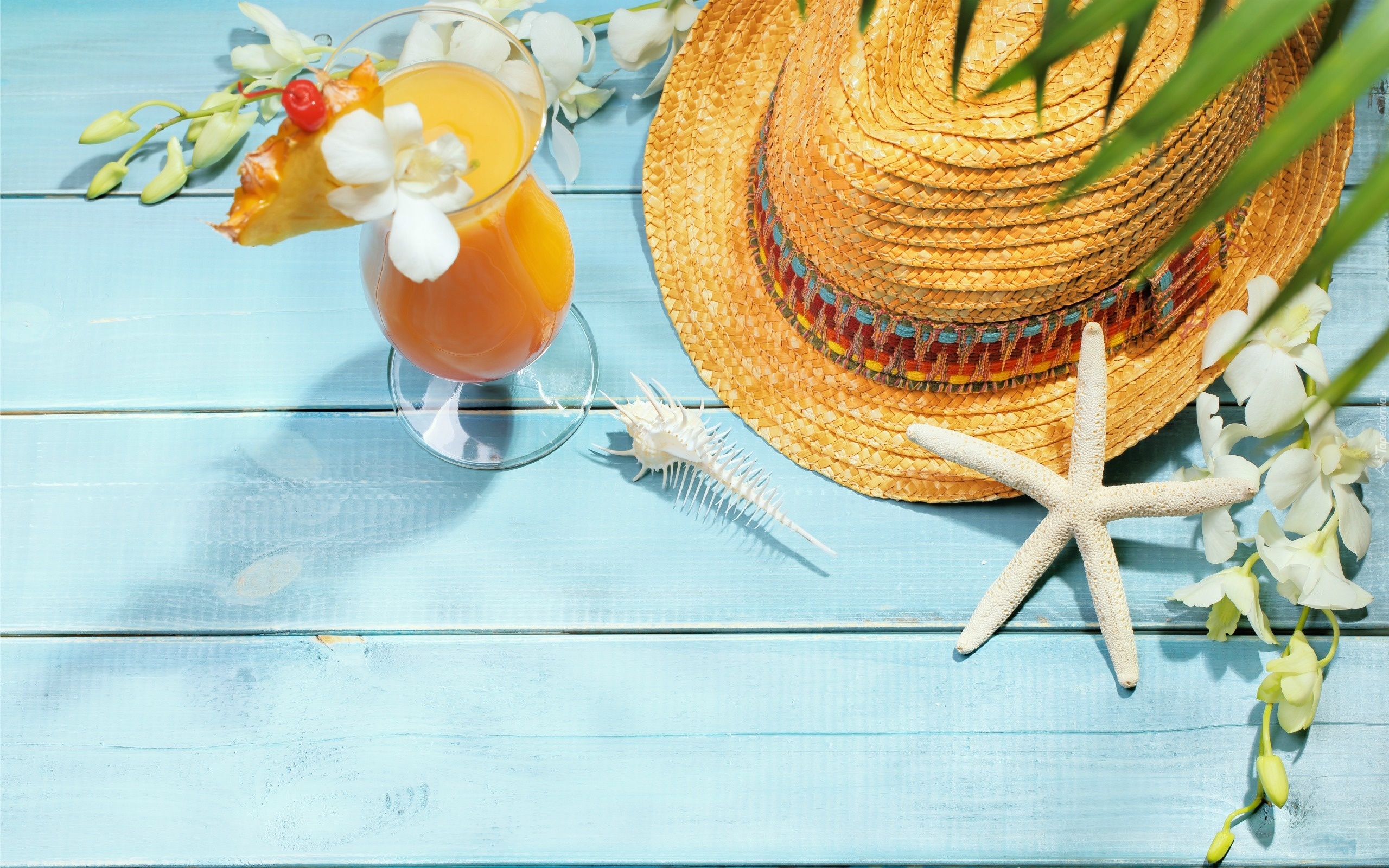 Edytor tapety: Koktajl, Kapelusz, Kwiaty, Ławka, Wakacje, Lato