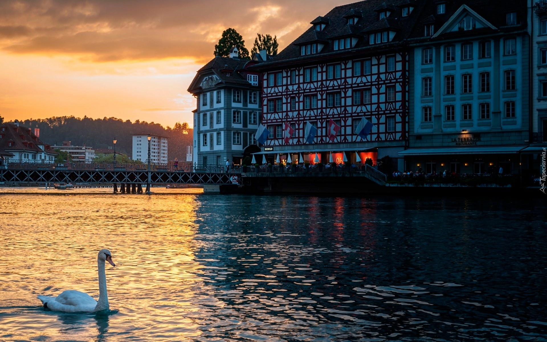 Edytor tapety: Rzeka, Łabędź, Most, Restauracja, Miasto, Zachód, Słońca